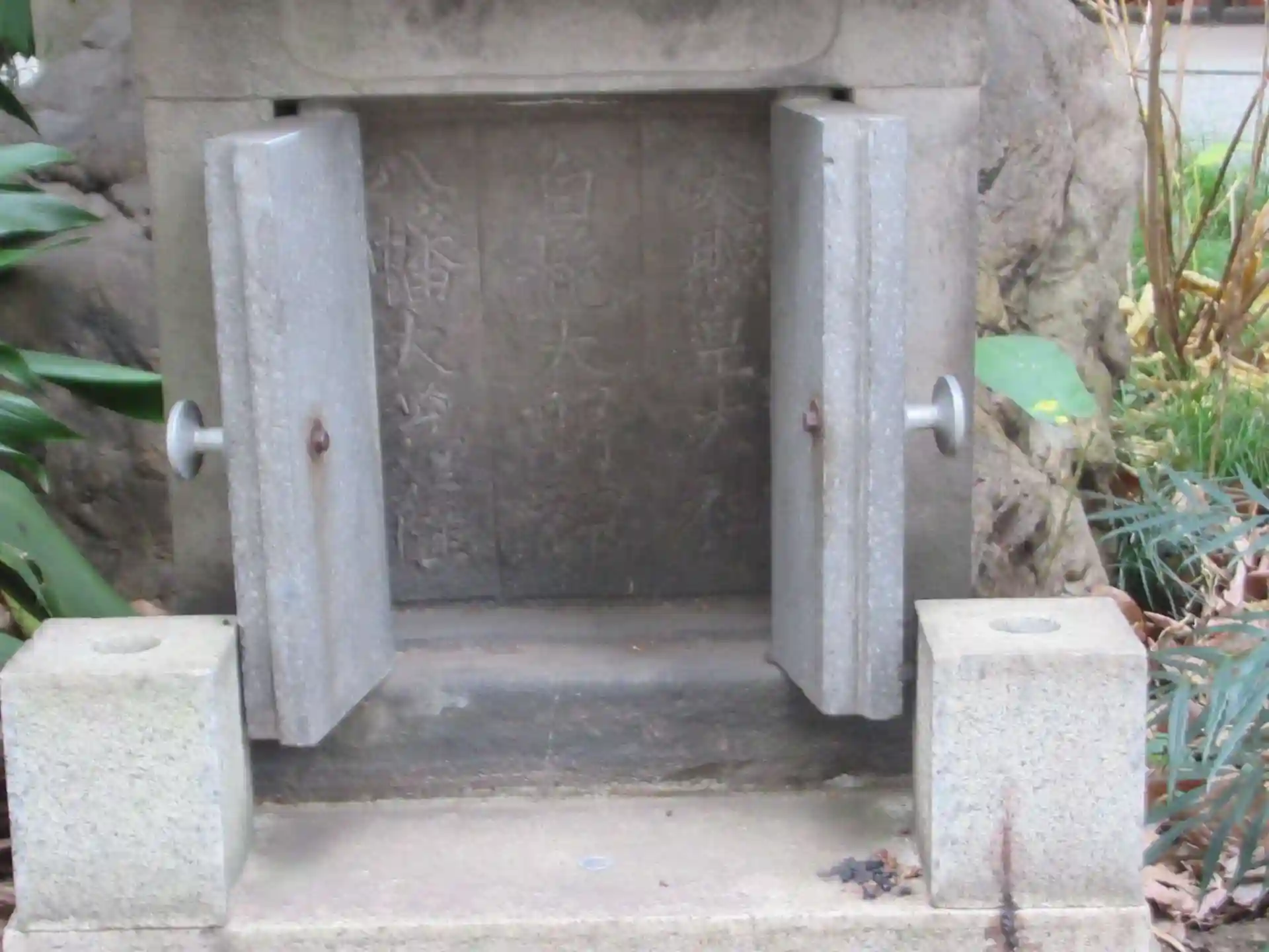 オフィスビルの入口の庭に建つ、小さな石の祠です。