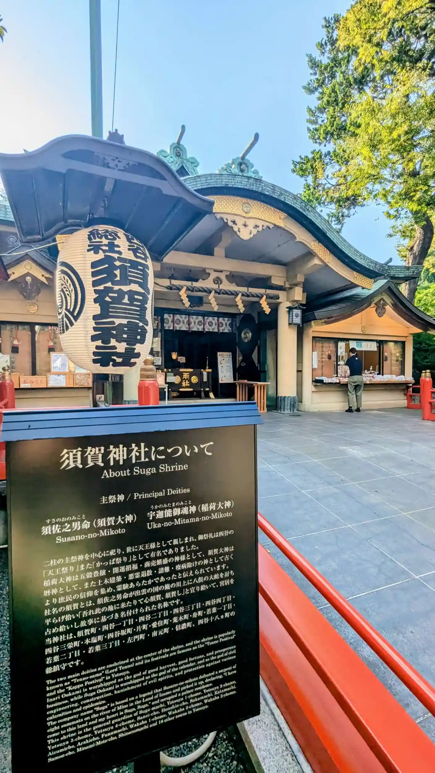 須佐之男命の鎮座の儀は、寛永十四年、島原の乱に日本橋大伝馬町の大名主馬込勘由と言う人が、幕府の命に依り、兵站伝馬のご用を勤め、その功績に依り、現在の四谷の中心一円の地を拝領したのを機会に、寛永二十年、神田明神社内に祀ってありました日本橋伝馬町の守護神(須佐之男命)を地元民の総発意で四谷に合祀し、御両社として祀る様になり、俗称四谷天王社と云い、明治維新まで親しまれて来ました。明治元年に須賀神社と改称され、明治五年に郷社に昇格、戦後は制度の改正により、旧社格は撤廃されました。