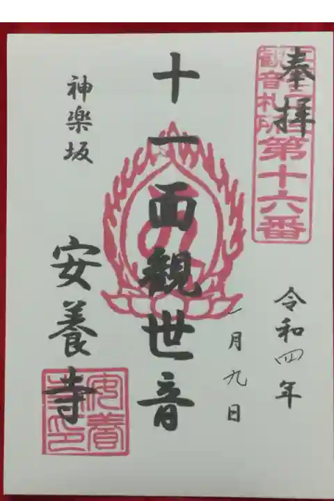 江戸三十三観音巡礼、第十六番札所。神楽坂通りの交差点脇のため、非常に賑やかな場所です。御朱印はこの時期書き置きのみの対応ですが、裏がシールになっていました。