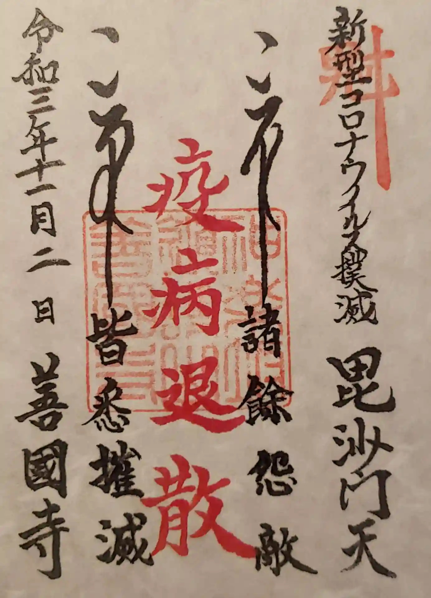 こちらに毘沙門天様が! 正面にお参りをして、左横の浄行堂でお参りして、右手の社務所へ。コロナ禍で、御朱印は書き置きのみとのことでしたが、最初に購入して、書いていただいてきた七福神めぐり用の色紙には書き入れしてくださいました! ミニご尊像も全員揃ったので、記念に飾る用の船もこちらで購入して、はじめての七福神巡り達成しました。
