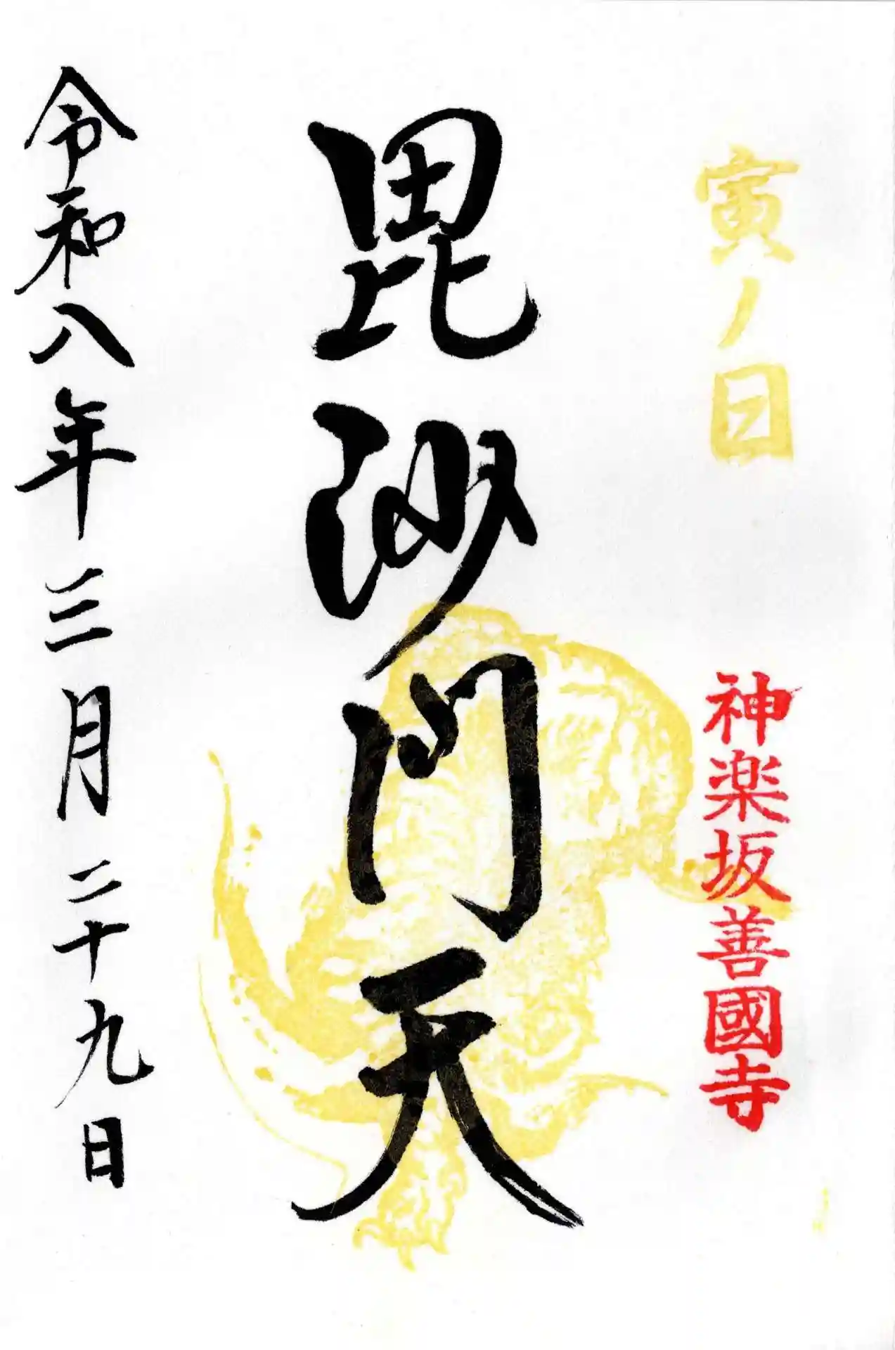 拝受した御朱印は、ちょうどこの日が十二支の「寅の日」にあたることから授与された特別な限定御朱印です。中央には黄金に輝く勇壮な虎の姿が描かれ、力強い「毘沙門天」の墨書きと見事に調和しています。右上には金色で「寅ノ日」の印が捺され、まさに毘沙門天様の御使いである虎の御加護を全身に受けるような、格式高くも華やかな一枚となりました。