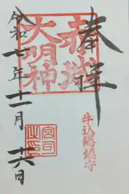 中央に大きく「赤城大明神」の四角の印、その下に「牛込総鎮守」の印と「赤城神社宮司之印」が押されています。右に「奉拝」の文字と、左に日付が書かれています。「拝」の文字がすらりと伸び、シンプルな美しい御朱印です。