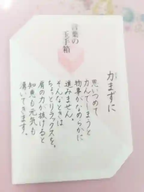 巫女さんが記す言葉の玉手箱。毎月2回、1日と17日に内容が変わります。これがすきでいつも楽しみにしています。今月の前半は「力まずに」でした。今日から内容変更なので載せました。