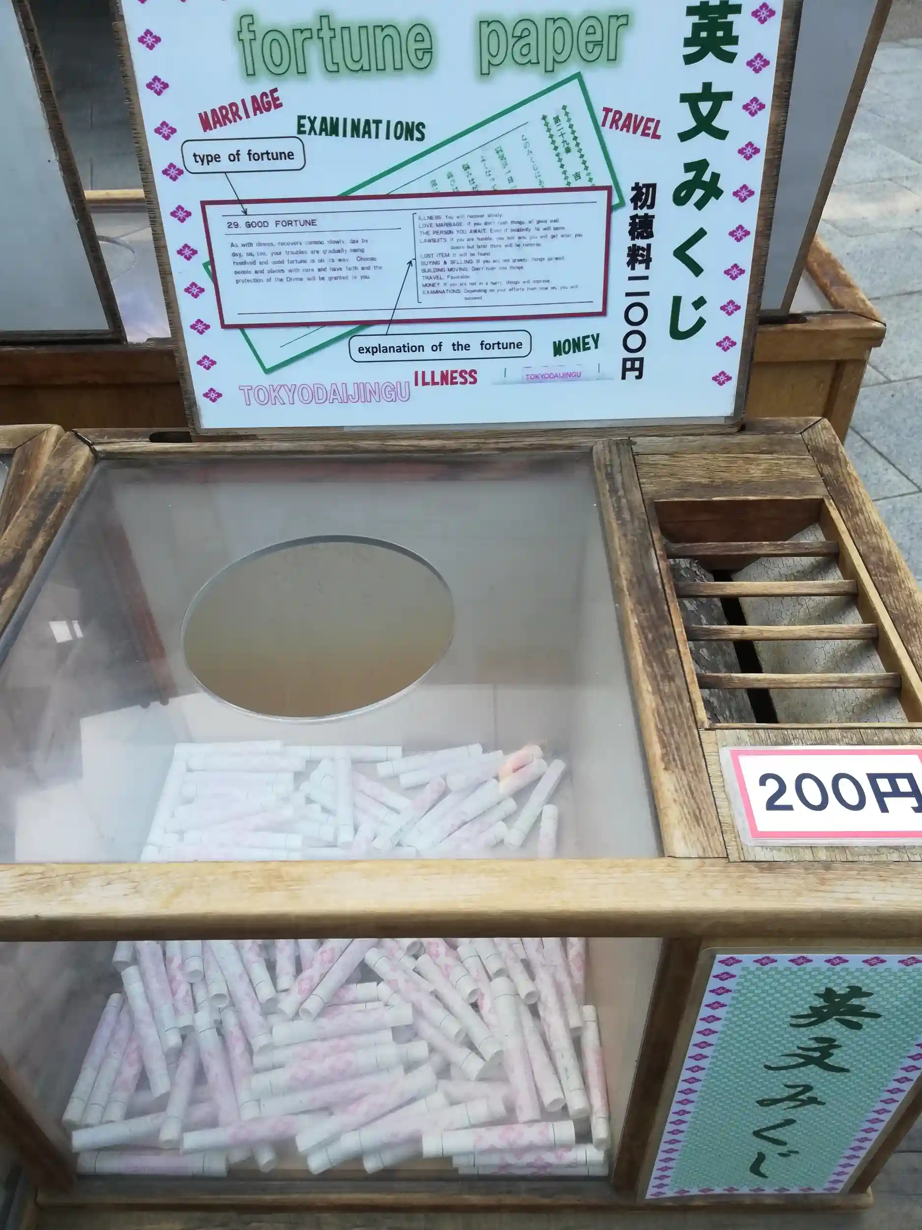 私は恋みくじは恥ずかしいので、普通のおみくじを引きました。英文みくじも置いてありました。