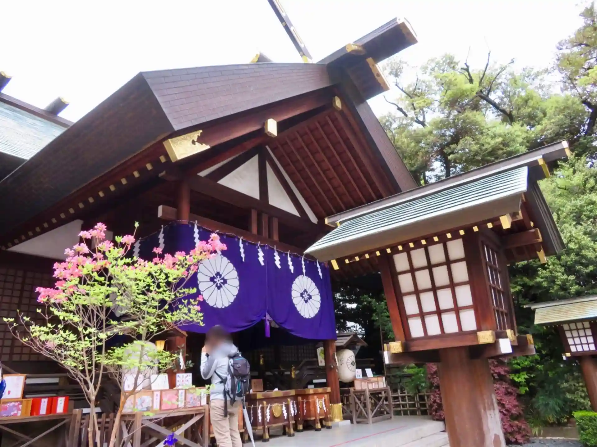 拝殿に掛けられている紫の紋幕と、ピンクのお花のコントラストが可愛らしいです。