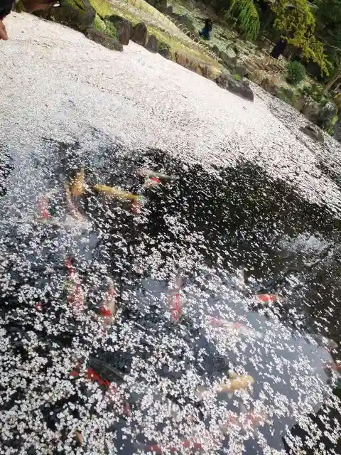 庭園の落ち桜と鯉の景色に酔いましたね。