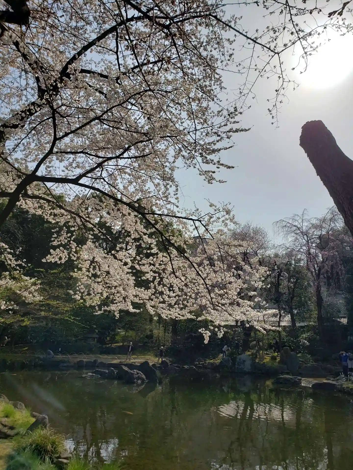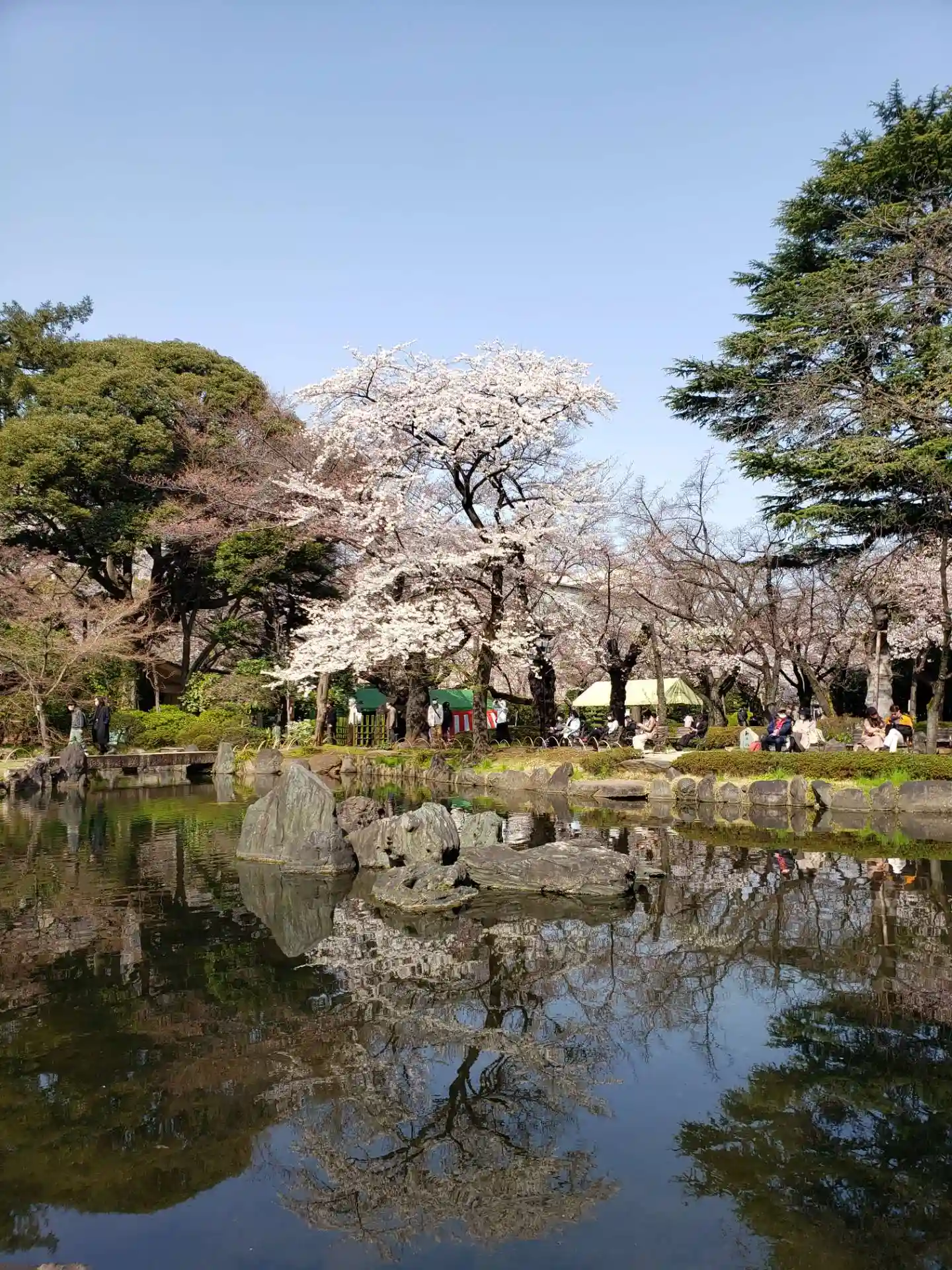 右手奥の神池へ。しだれ桜はまだまだですが、満開の木もあり、間隔開けて配置されているベンチも半分以上空席だったので、まず、神池を一周してから(池周り散策も人で渋滞も一切なく、立ち止まって写真を撮る人も、密になることもなく)、仮説の売店で甘酒を買い、空いているベンチで休憩しながら、ゆっくり池と桜を堪能して来ました。