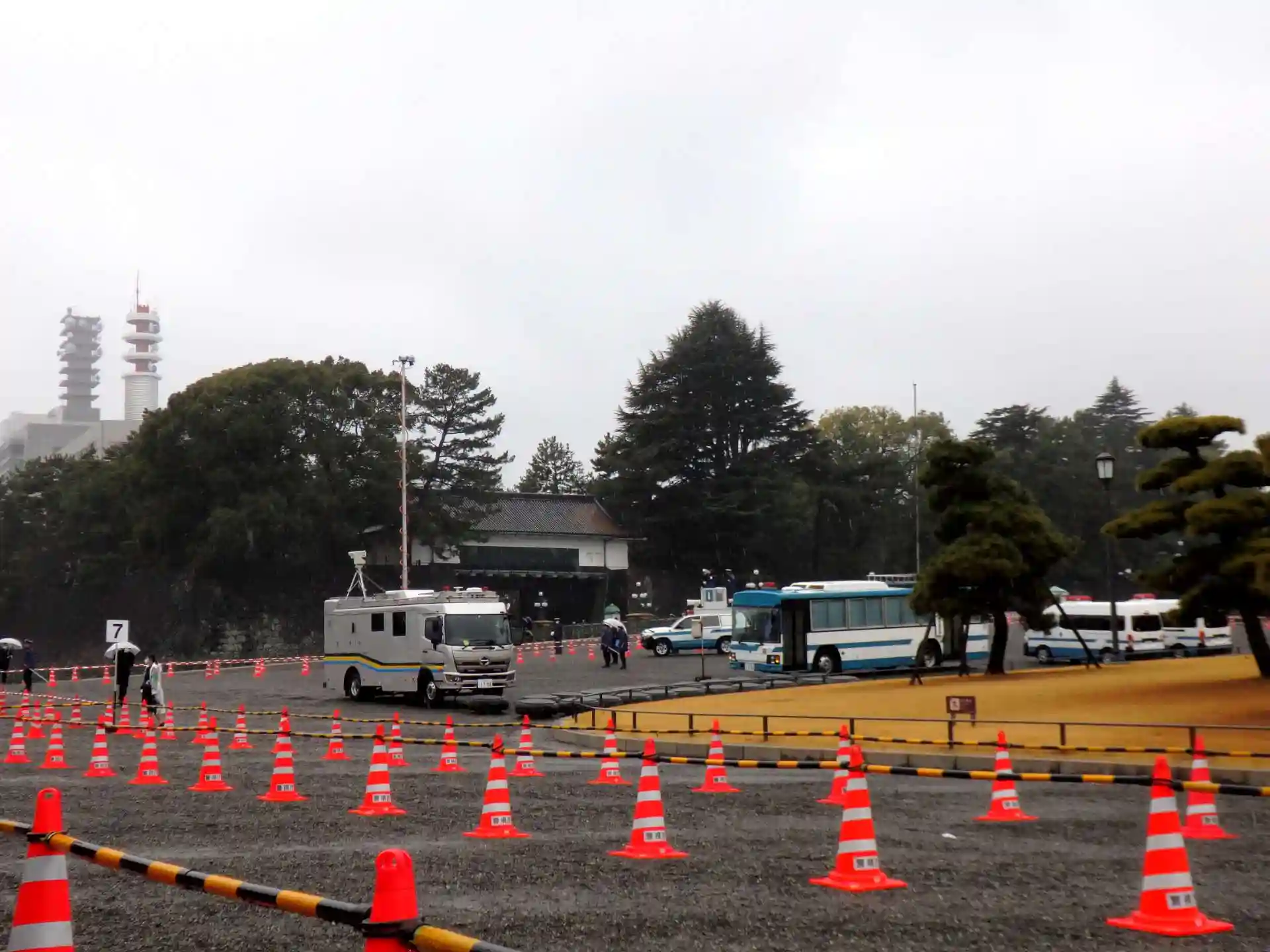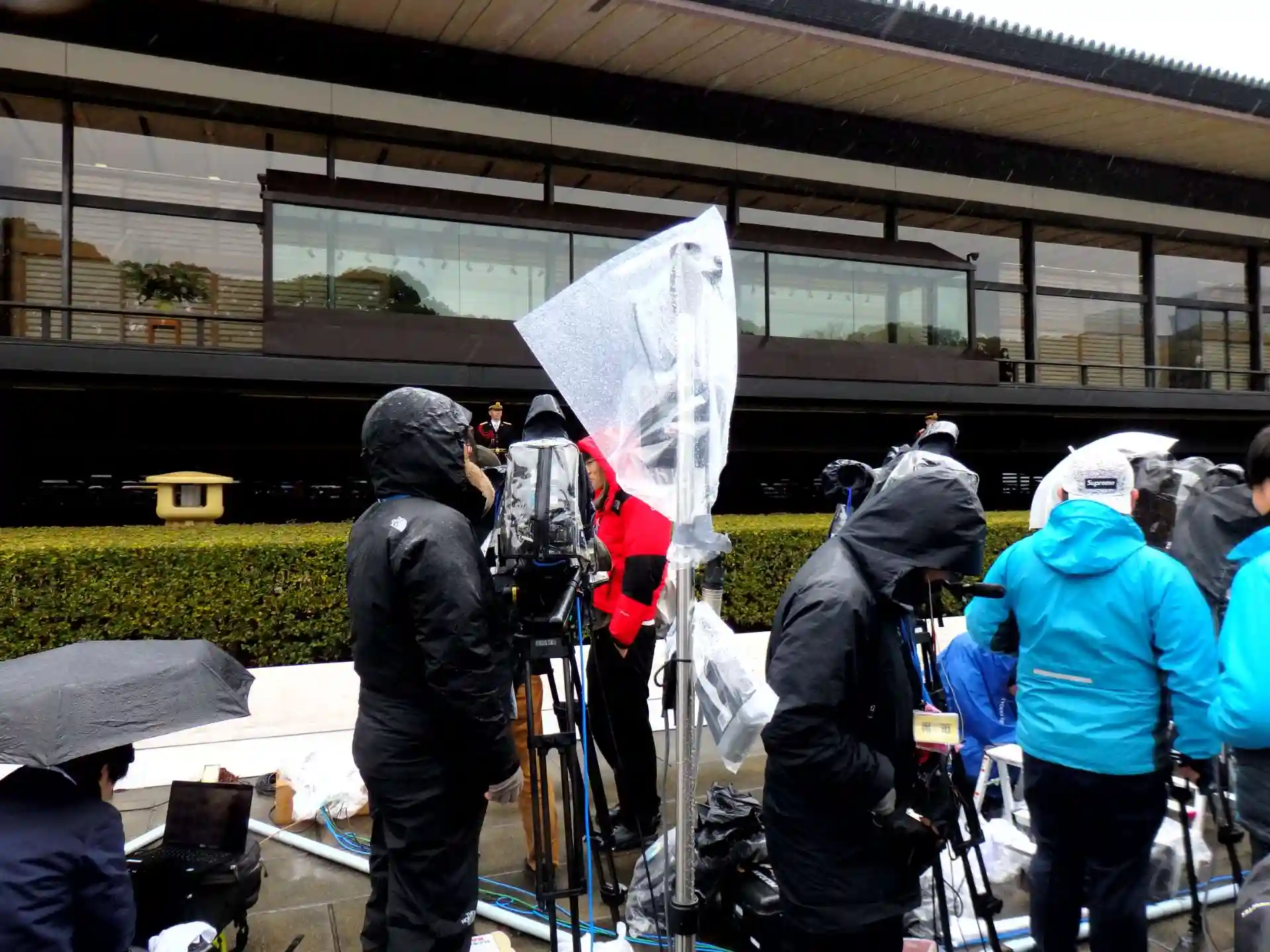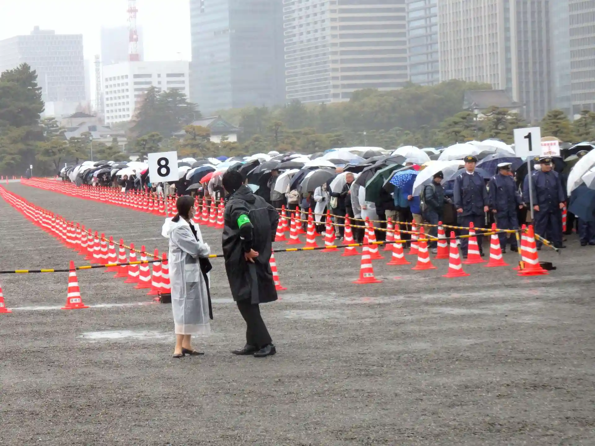 この女性、カッパも被らず傘もささず気合いの入った警備です。