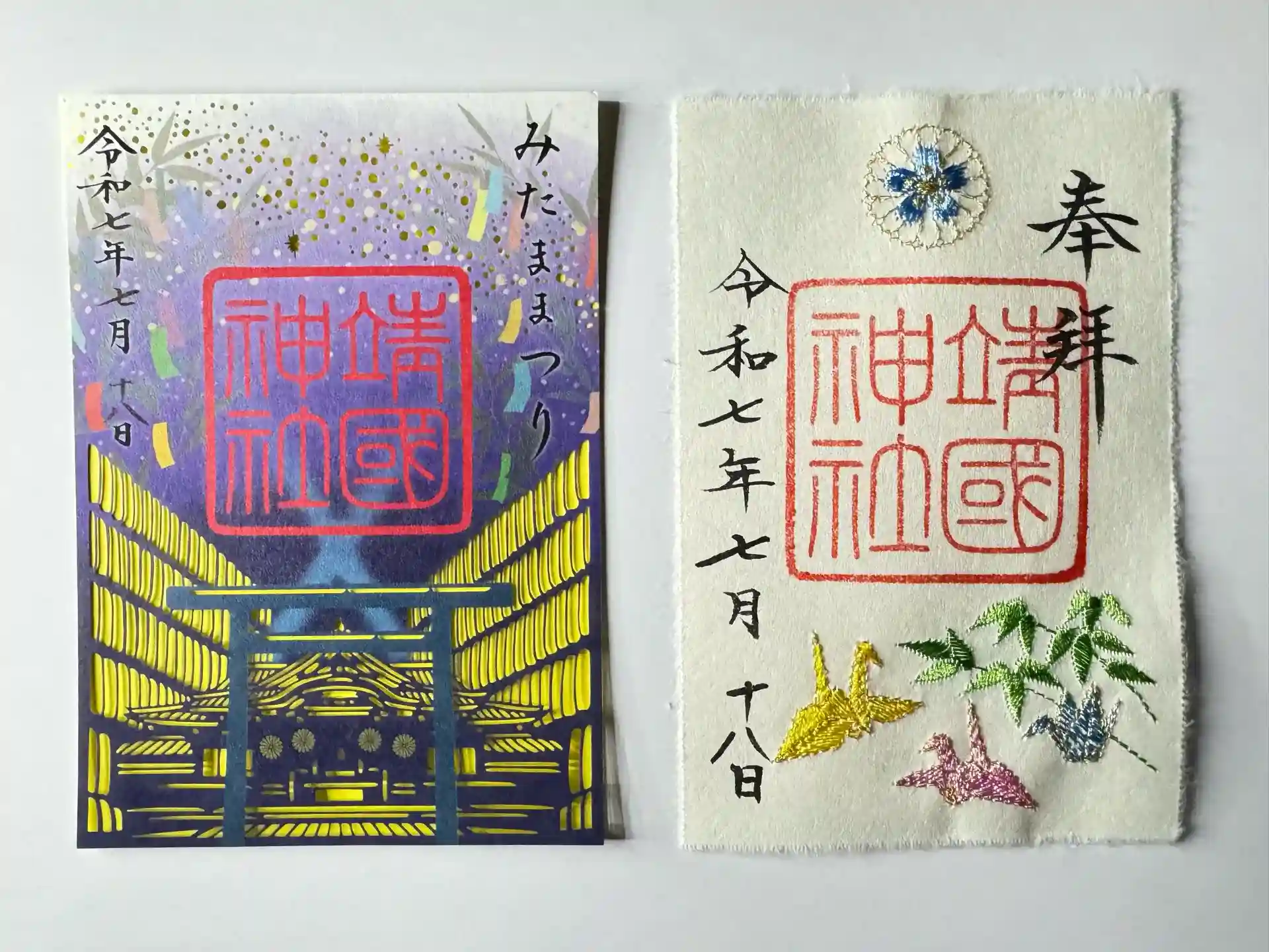 書き入れの御朱印と夏の刺繍御朱印、みたま祭りの切絵御朱印をいただきました。