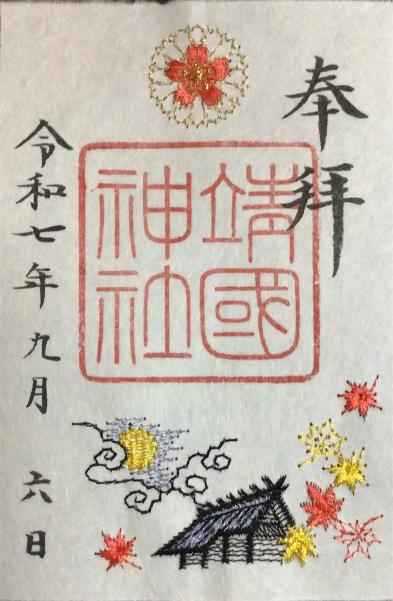 御朱印は、書き入れていただく通年のものは,今回はいただかず、9/1〜頒布されている秋の特別刺繍御朱印のみ頂きました。