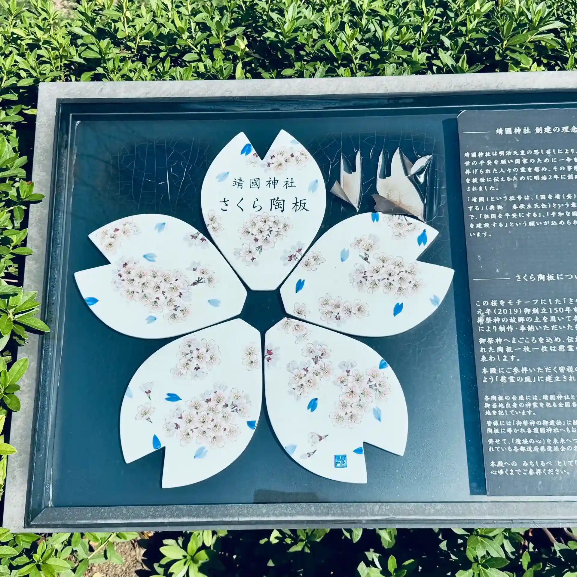 境内の公園内にある桜のモチーフの🌸さくら陶板は全国から集まった尊い御英霊の故郷の土を用いて作成、奉納されたものです。
