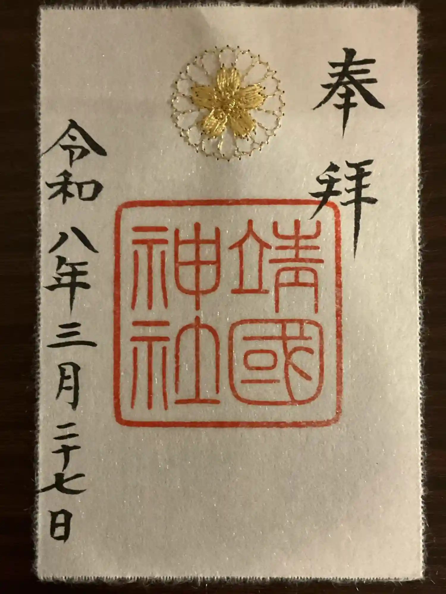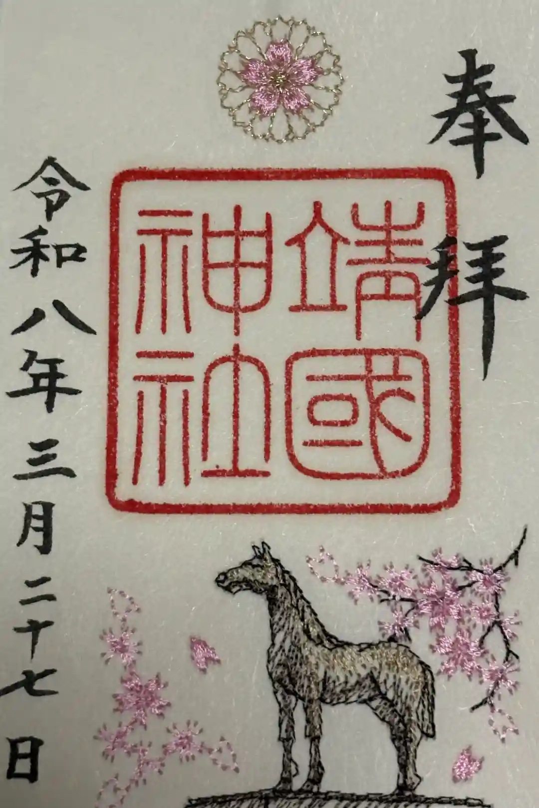 春限定の刺繍御朱印(銀糸で菊の御紋に桜と、馬と桜の刺繍)