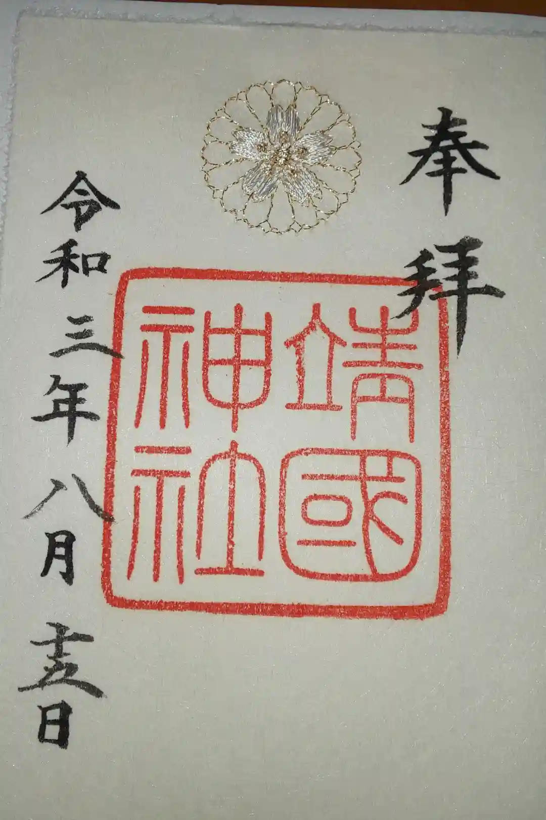 美濃和紙に桜色の社紋と、桜花・白鳩を刺繍した御朱印です。