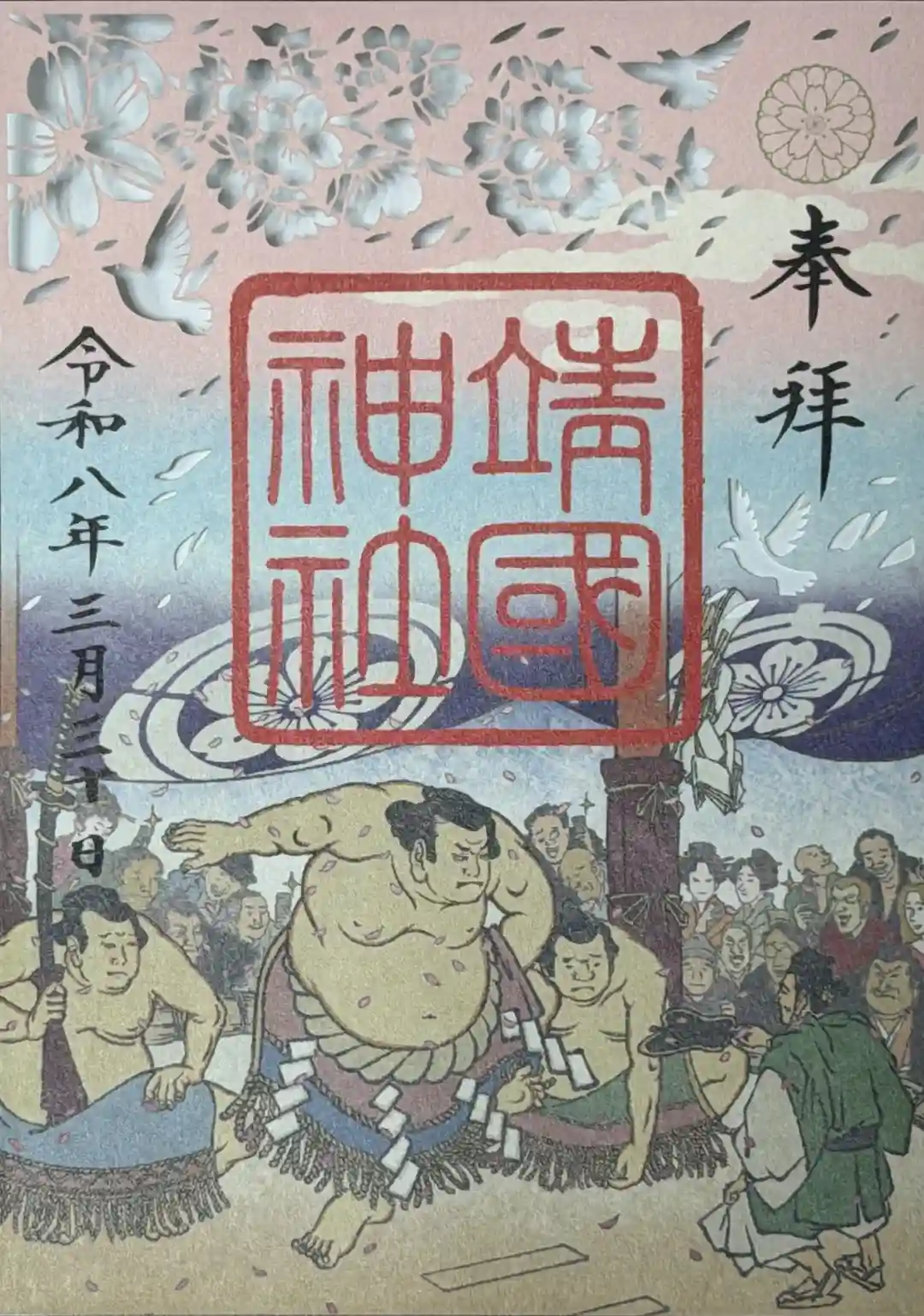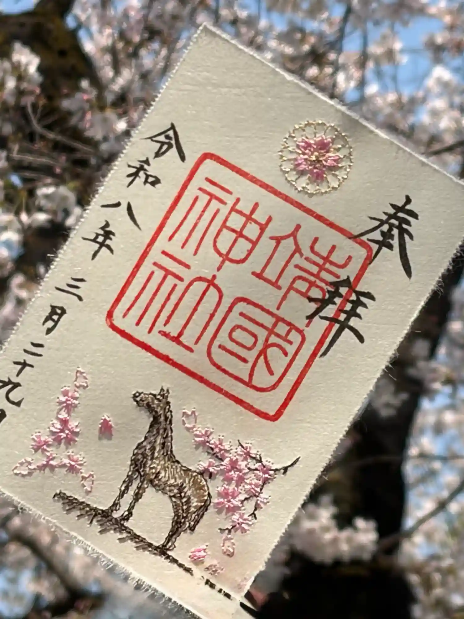 春限定の刺繍御朱印(銀糸で菊の御紋に桜と、馬と桜の刺繍)