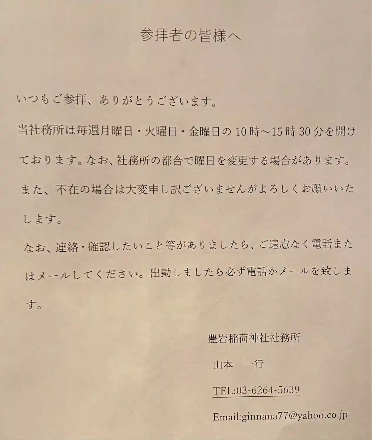 社務所開設:月・火・金10:00-15:30
