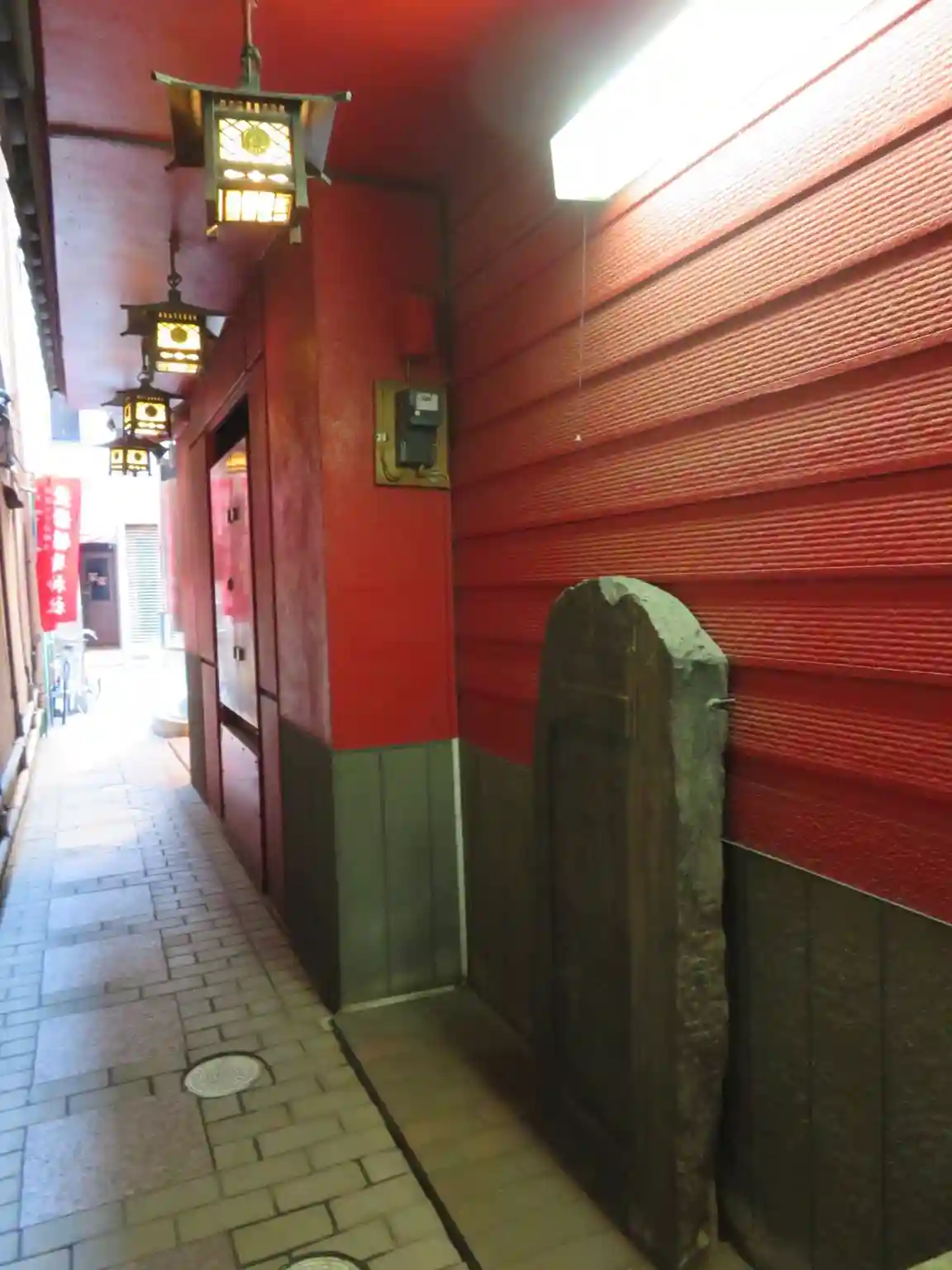裏路地からさらに細い道に入るのかと思ったのですが赤い幟があって…