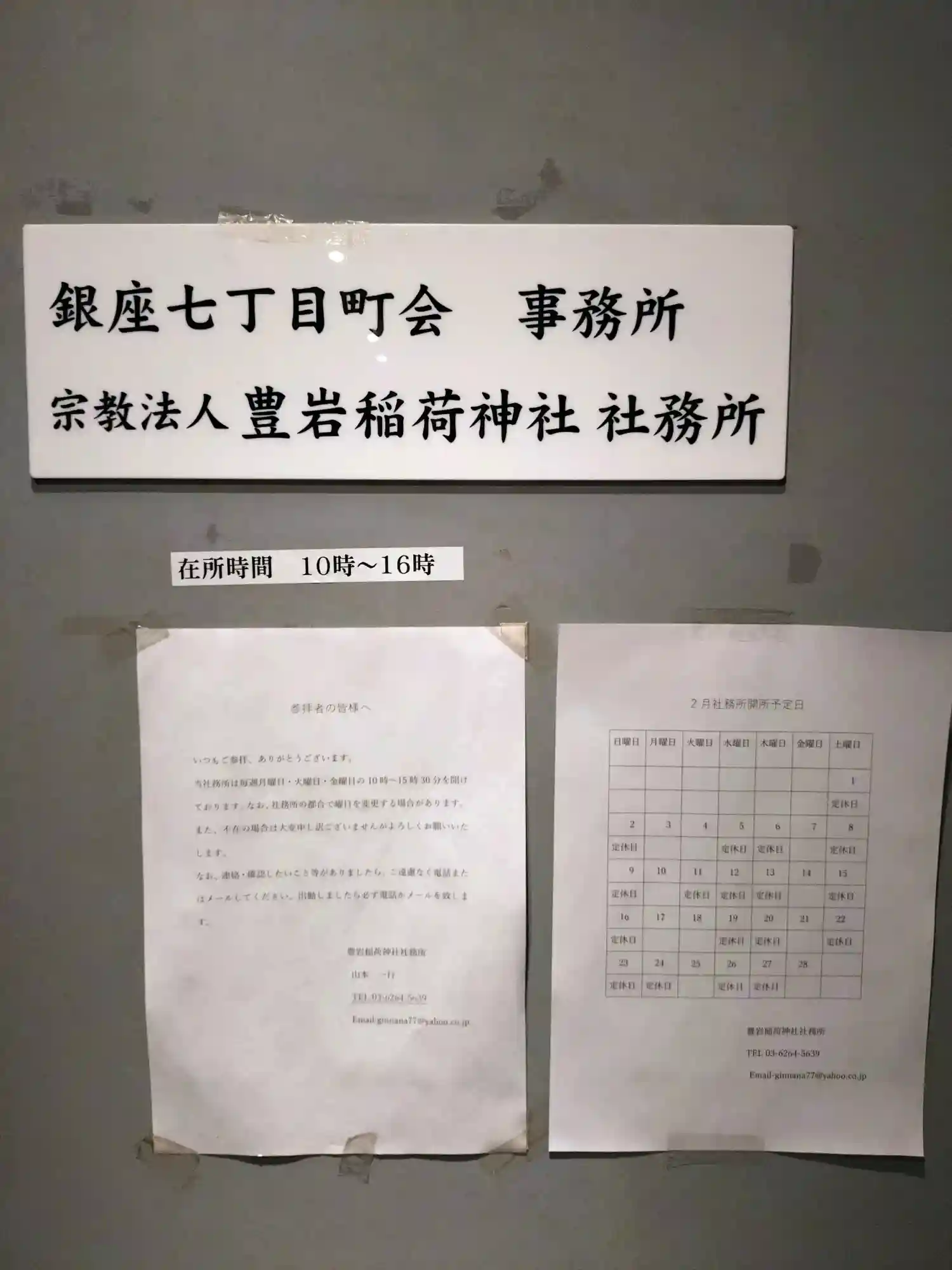 2月の初旬に参拝させて頂きました!銀座の路地にある小さな神社です。地下に社務所があるのですが月・火…
