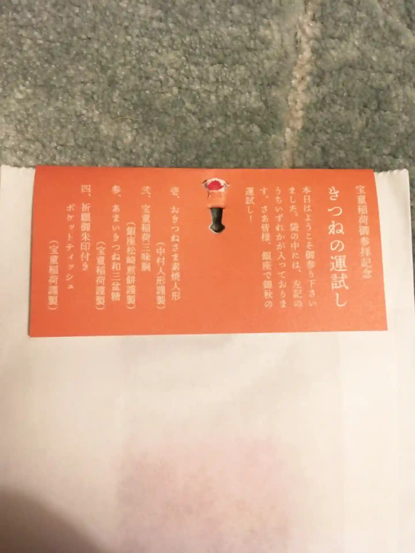 裏を見ると、「きつねの運試し」として、四種類の記念品からどれか一つが無作為に渡される旨が書いてありました。1.おきつねさま素焼き人形、2.宝童稲荷三味胴、3.あまいきつね和三盆糖、4.祈願御朱印付きポケットティッシュ だそうです。