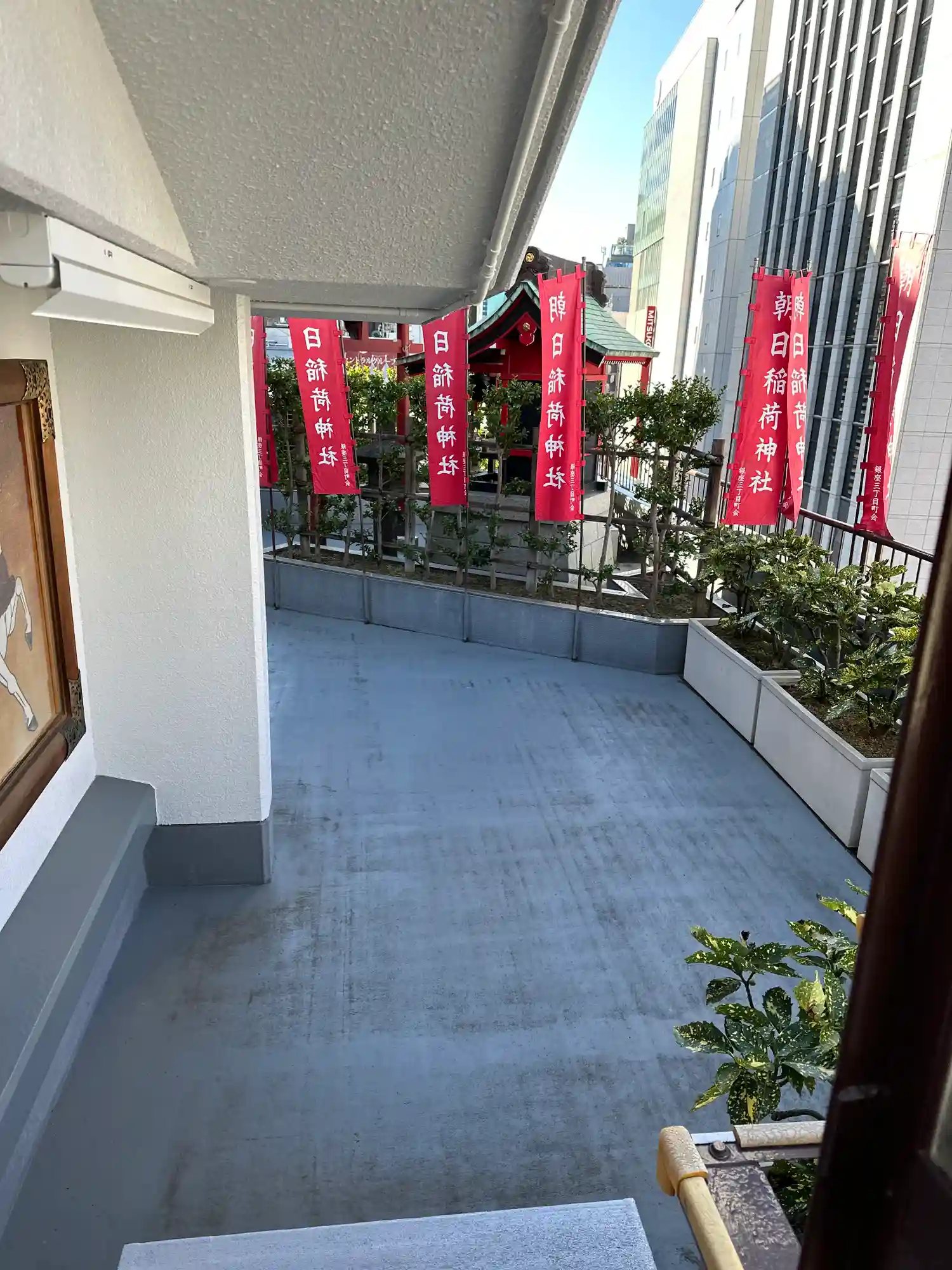 銀座のビルの屋上に鎮座するので、エレベーターの先、非常階段を使って屋上にあがります。