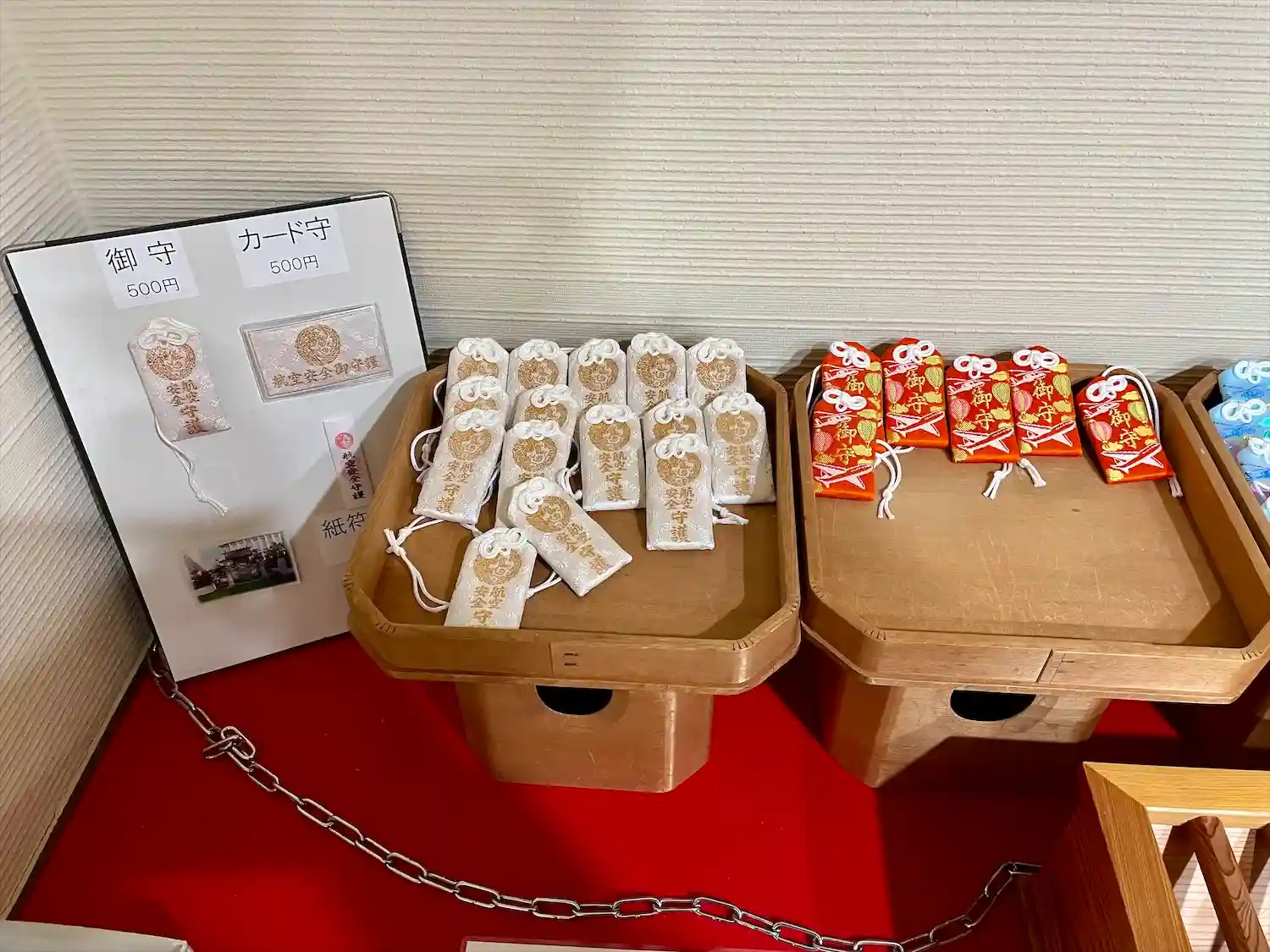そこに授与品の数々。お代は小さな賽銭箱へ。