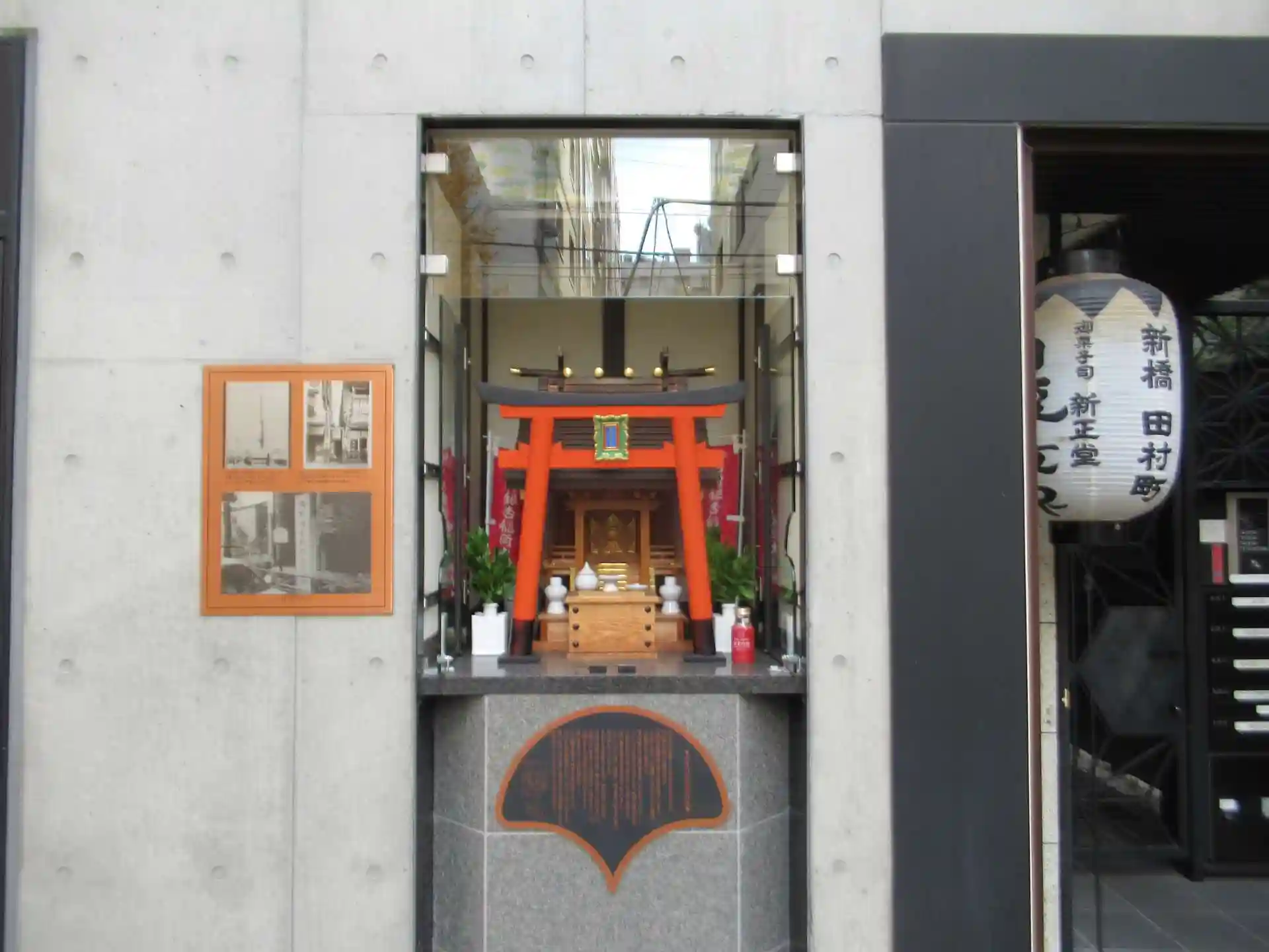 大東亜戦争ので焼けてしまったあと、区画整理や再開発で何度か移転したようで、今は浅野内匠頭にちなんだ切腹最中で有名な新正堂という和菓子屋さんの裏手の工場ビルにお祀りされています。