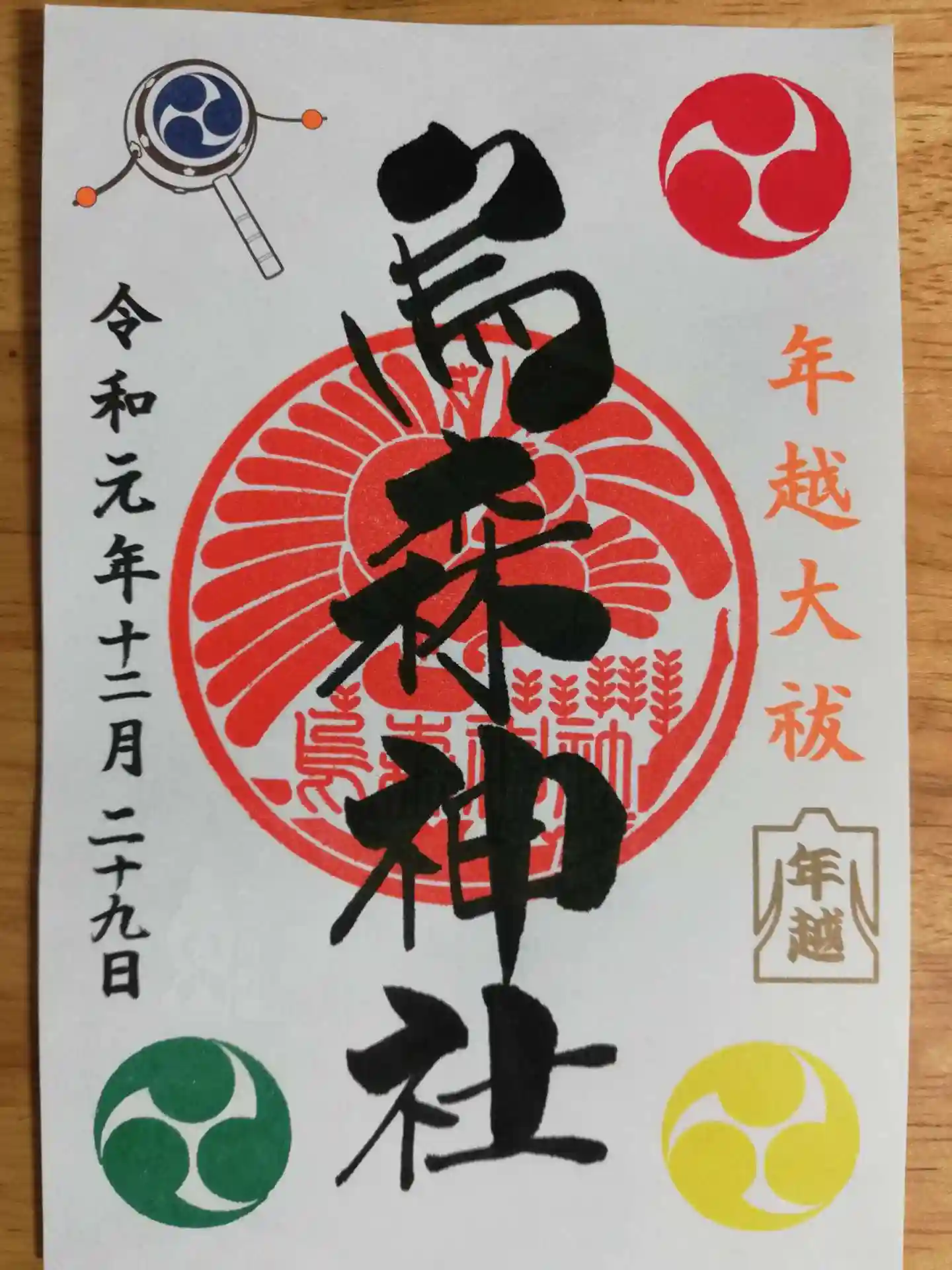 年越大祓の御朱印をいただきました。紺色の三巴がでんでん太鼓になっていて可愛いです