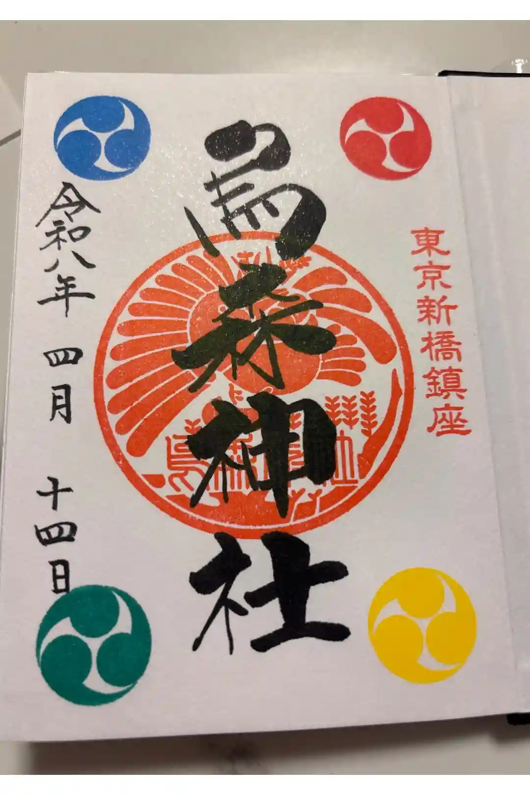 右に東京新橋鎮座の印、四隅に赤・黄・青・緑の4色の巴紋、真ん中に烏をあしらった社紋の印が押された御朱印です。