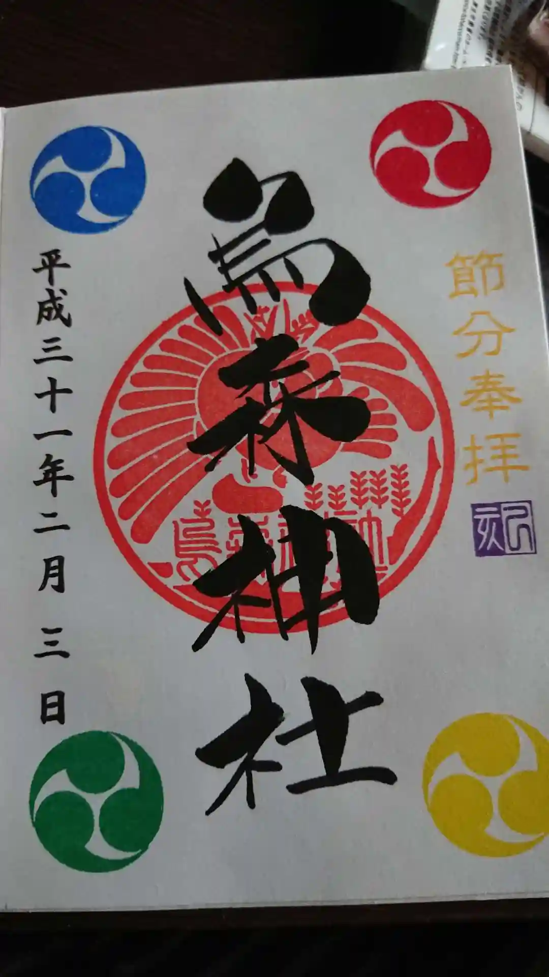 御朱印は書置きですが節分ので、透かしで節分祭の印が押されてます(分かるかな…)。
