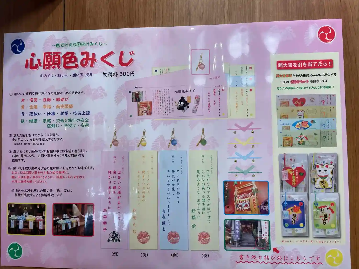 願意・占うものにより4色に色分けされた独自のおみくじで、おみくじ・願…