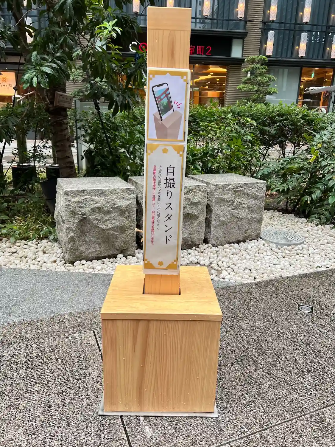 「自撮りスタンド」が何本かありました。また、拝殿の端の方におみくじ撮影用のスタンドも。