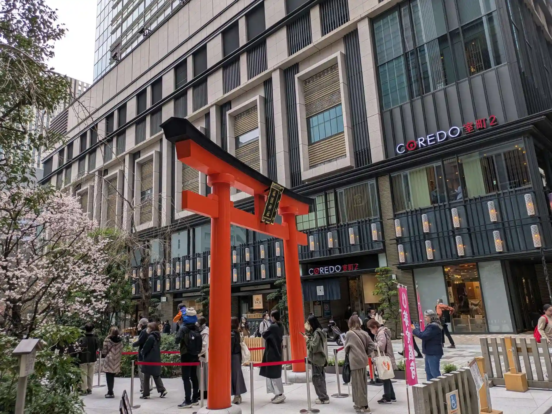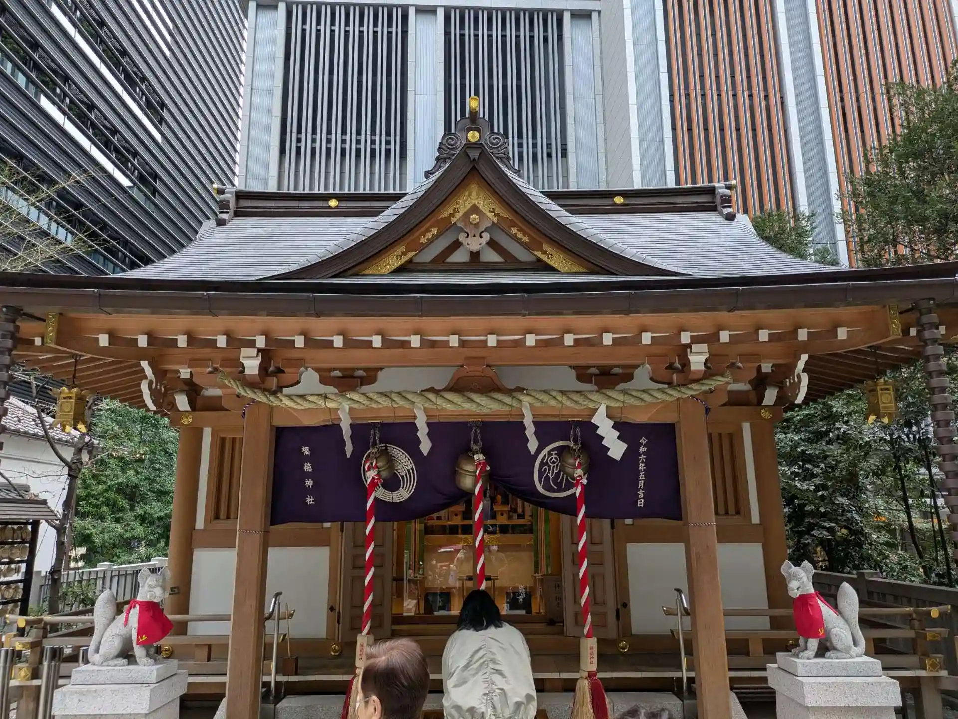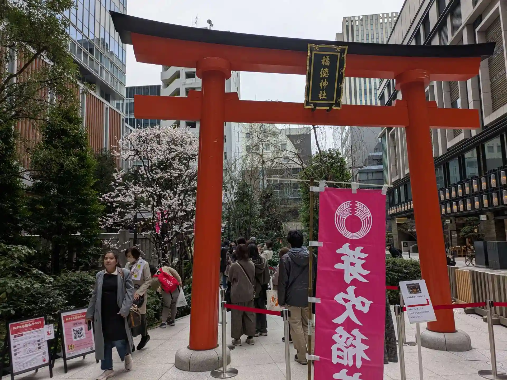 日本橋に訪問する事があり、福徳神社へ初めてのご挨拶にお伺い致しました。日本橋室町の名所、コレド室町の並びに鎮座するという場所柄もあり、好天では無いにもかかわらず非常に多くの方が参拝にいらっしゃっていました。