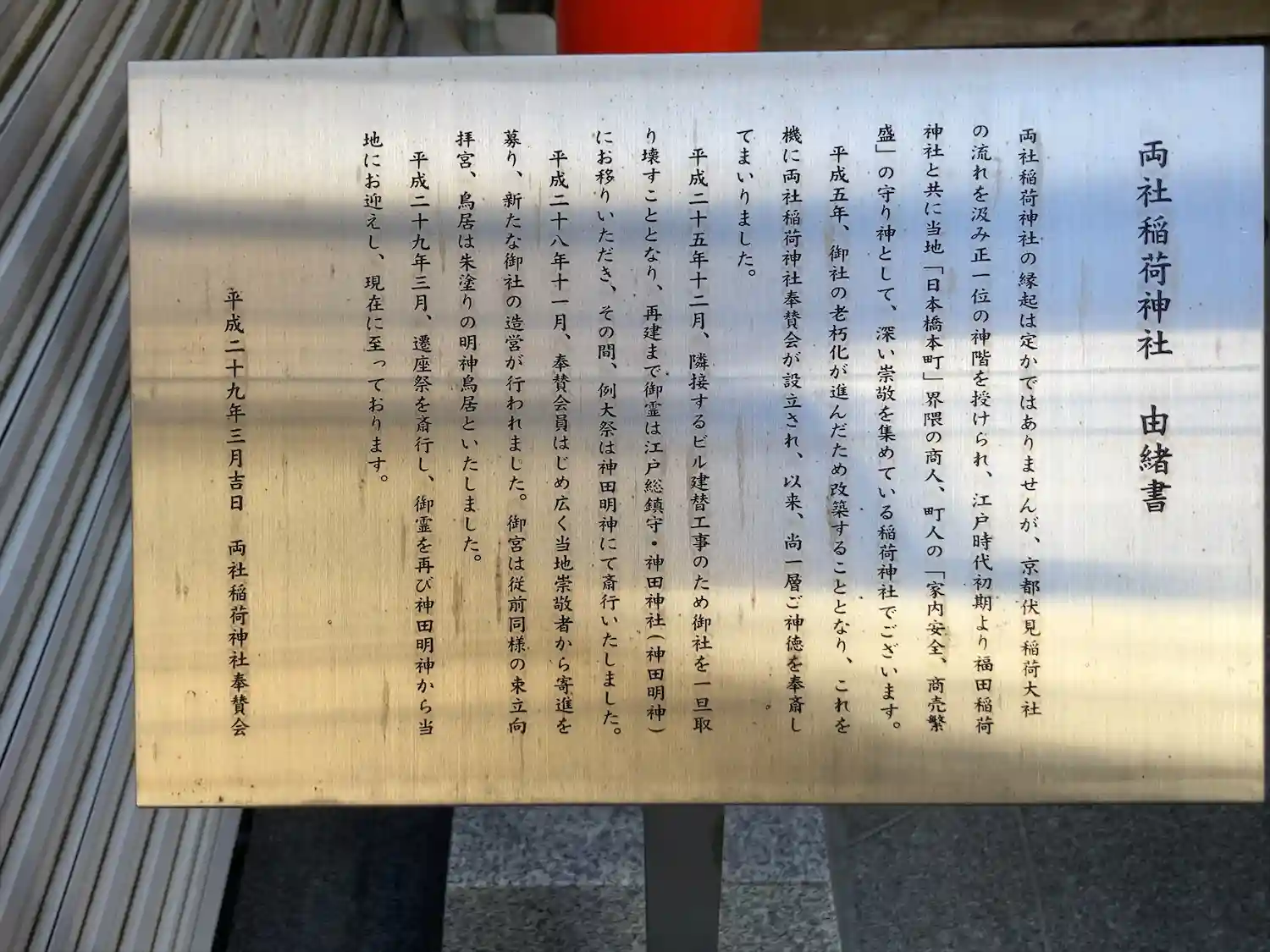 | ご由緒 | (「両社稲荷神社 由来書」の立て札より) 両社稲荷神社の縁起は定かではありませんが、京都伏見稲荷大社の流れを汲み正一位の神階を授けられ、江戸時代初期より福田稲荷神社と共に当地「日本橋本町」界隈の商人、町人の「家内安全、商売繁盛」の守り神として、深い尊崇を集めている稲荷神社でございます。
