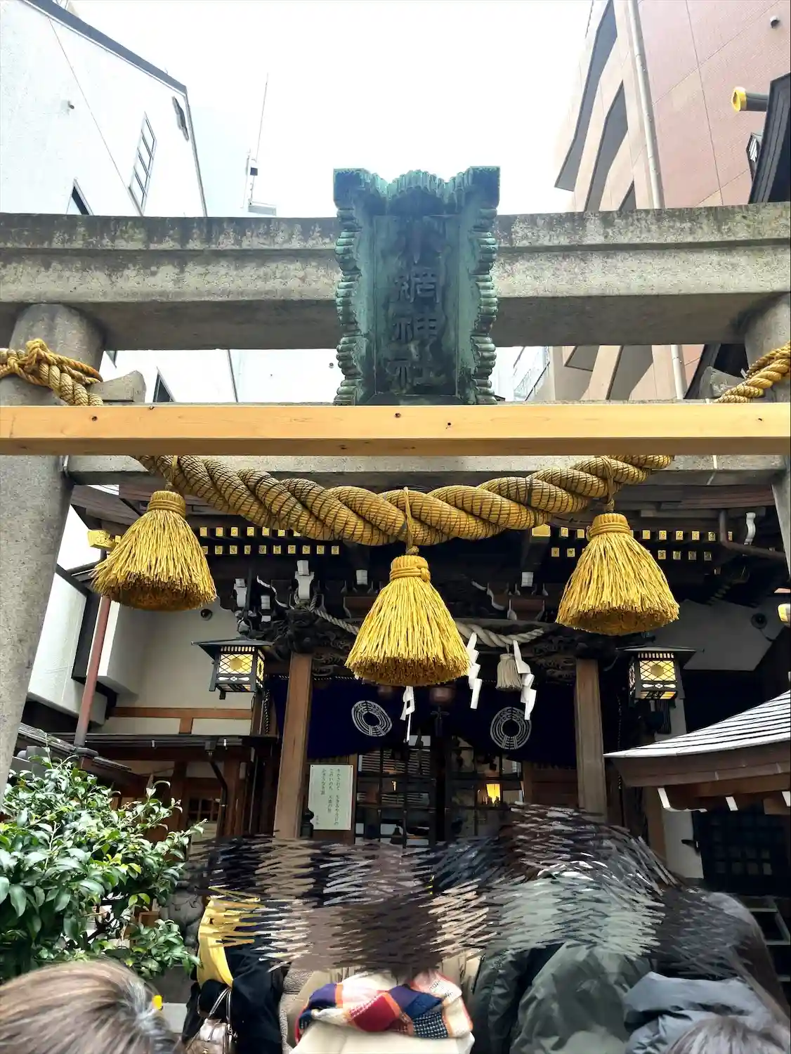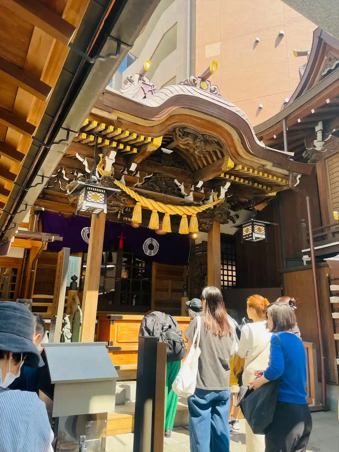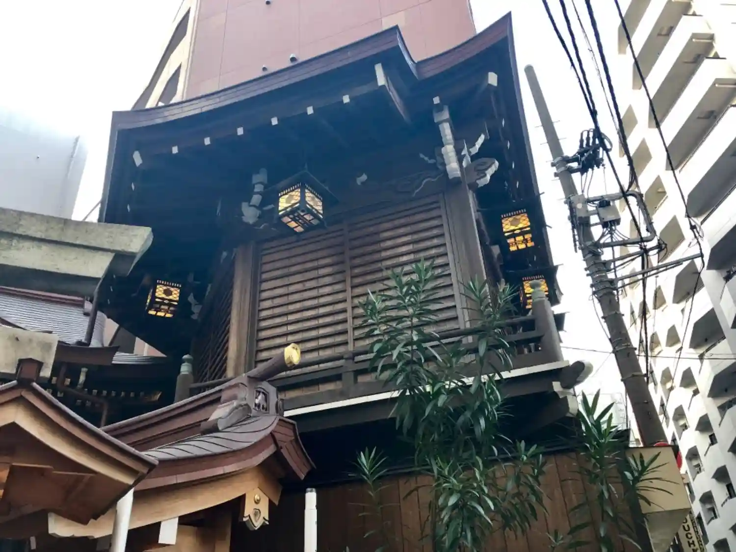 高い建物の間に囲まれた小さな神社ですが、