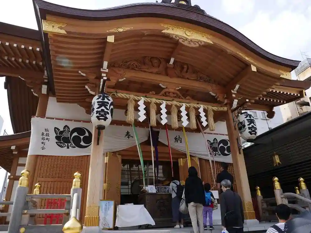 1階部分や2~3階の社務所は堅牢なビル。大きな社殿は1階の屋上に建っています。通りからよく見えます。最初に見たときは、ちょっとびっくりしました。安産祈願の方が多い神社です。