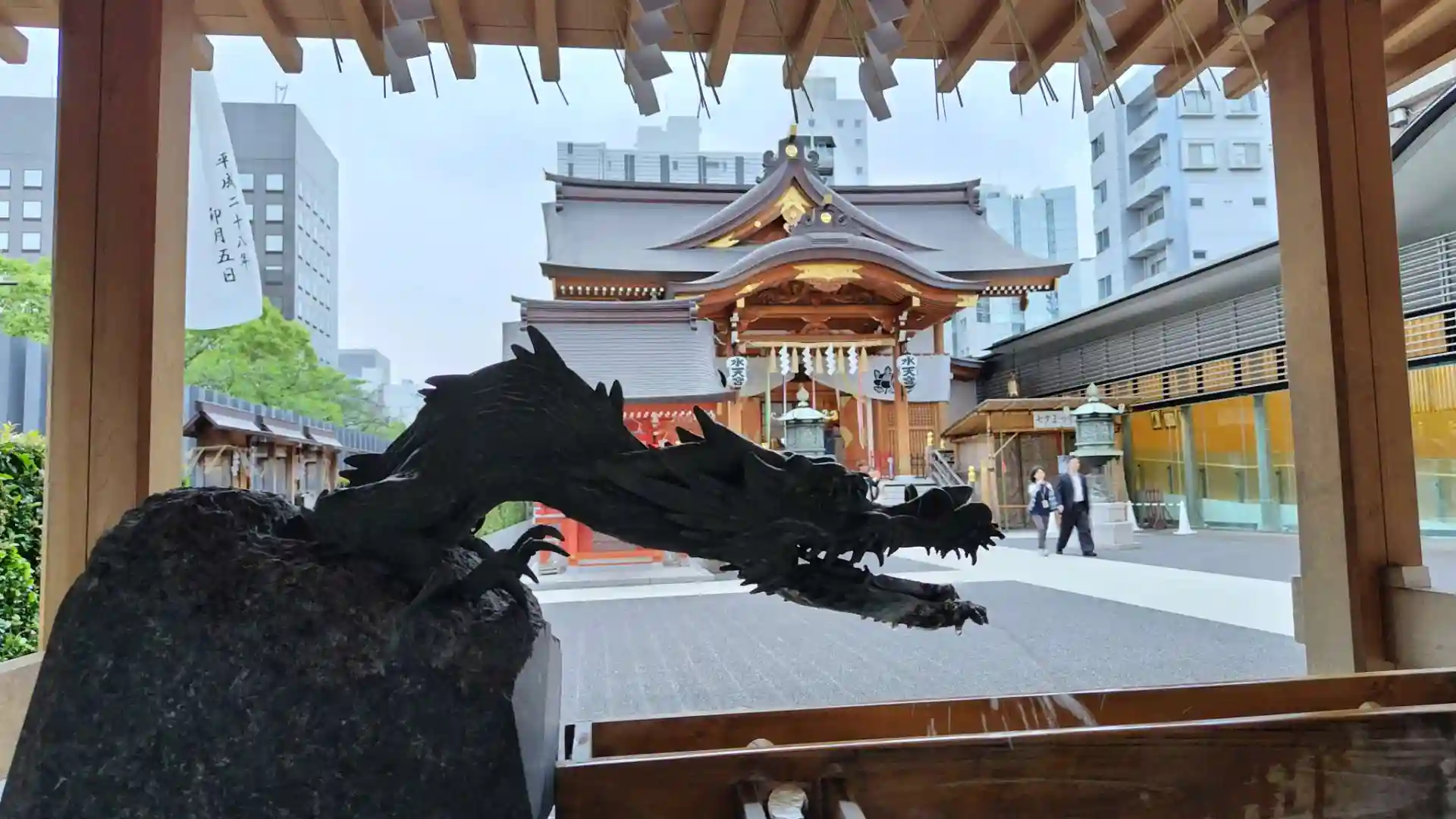 手水舎の龍越しの本殿☺️
