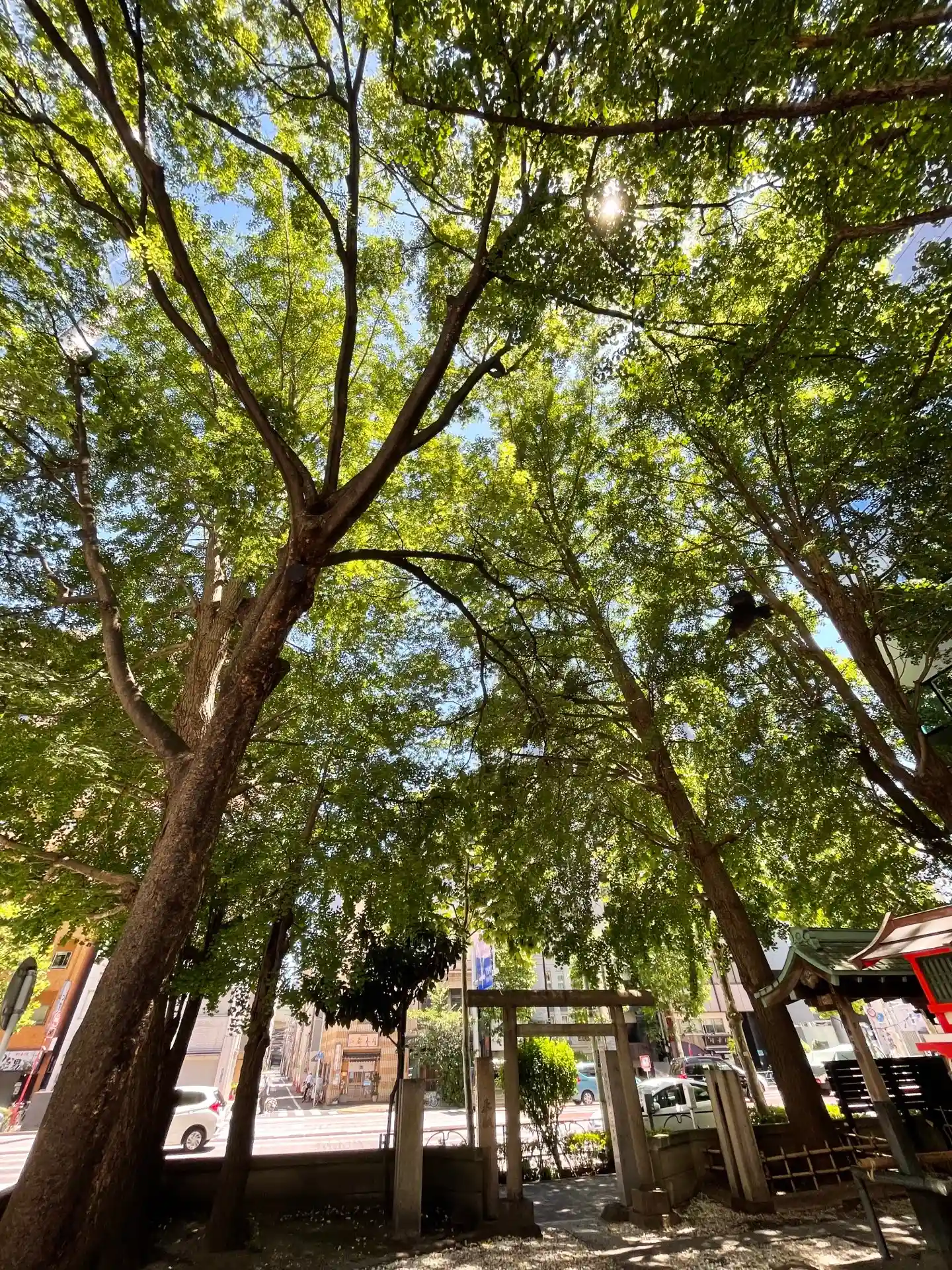 銀杏八幡宮@日本橋蛎殻町。その名が示す通り小さな境内には20メーター級の銀杏が5本あり、よく茂った枝葉で空も見えないほどです。