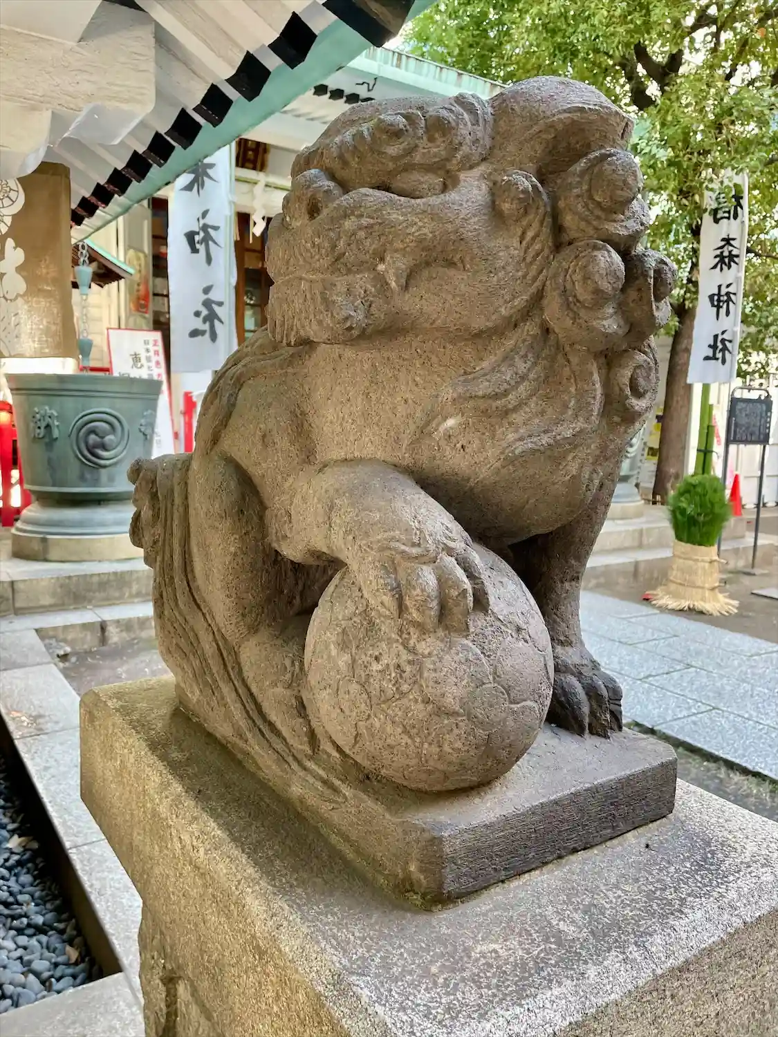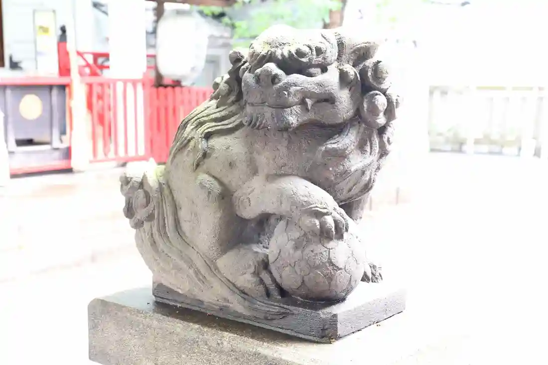手毬のような珠を手にしている可愛らしい狛犬。