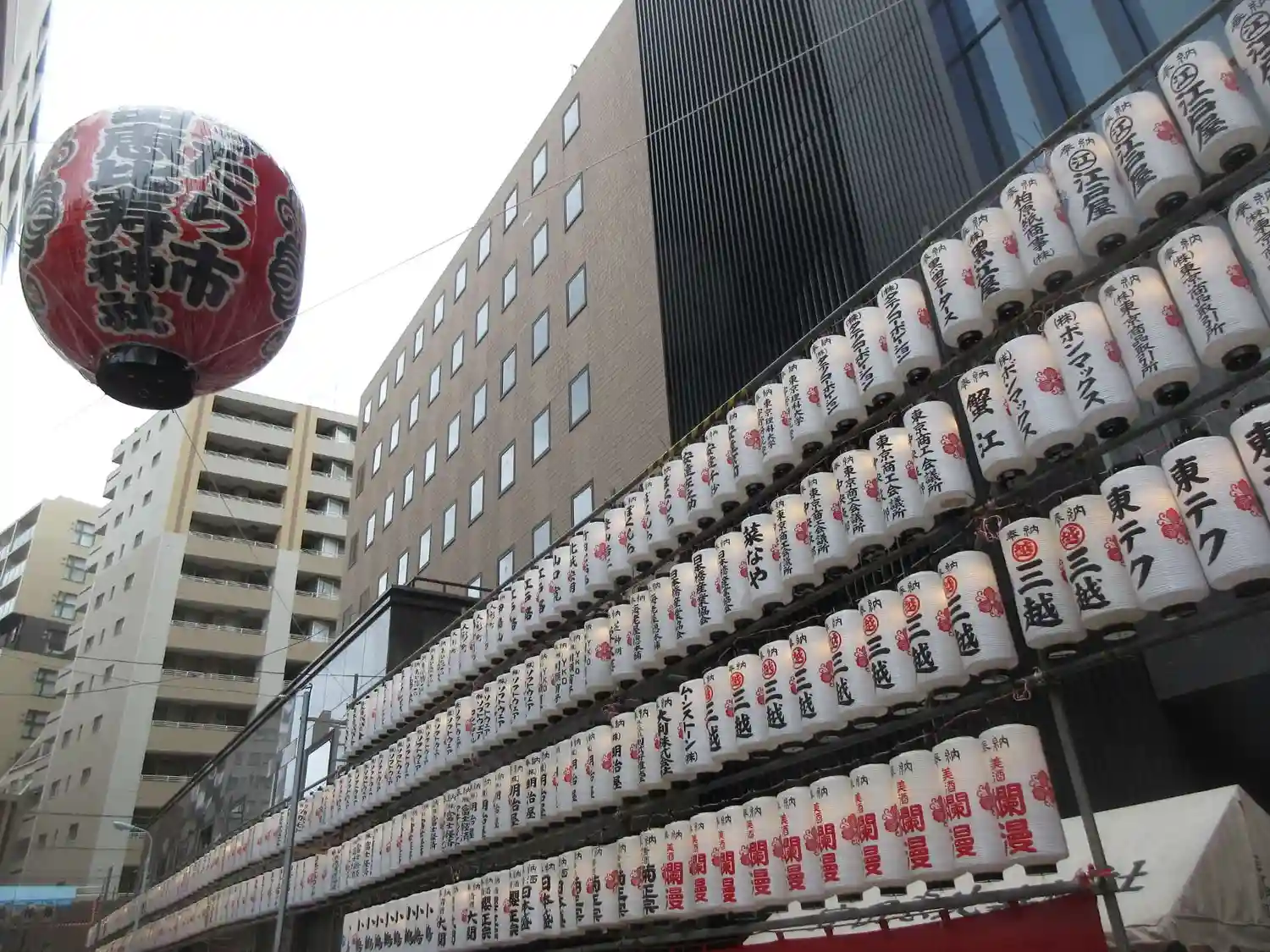 えびす通りにずらりと提灯が並び賑やかです♪大きな赤提灯は宝田恵比寿神社の上空にあってお参りの目印となりました🏮