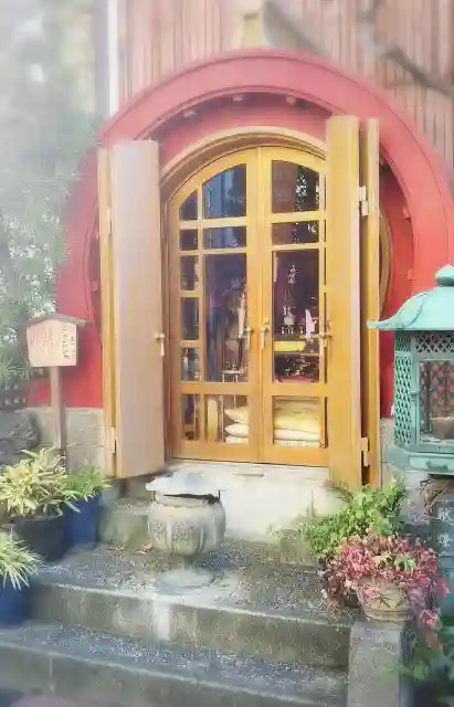 丸いデザインの赤いお堂は正面が硝子張りでキラキラしてます✨