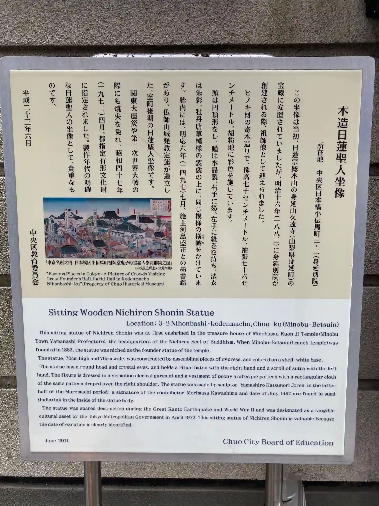 当院の敷地を含む小伝馬町の一帯は、江戸時代の有名な牢屋跡地です。吉田松蔭・橋本左内等の幕末の志士を始め、八百屋お七などの放火犯、盗賊などが収容されていました。明治になって取り壊された跡地は荒れ果てていましたが、ここに法華の道場を建立して多くの獄死亡霊を慰め、一転して理想の仏国土を建設せんとして開かれたのが当院です。(後略)