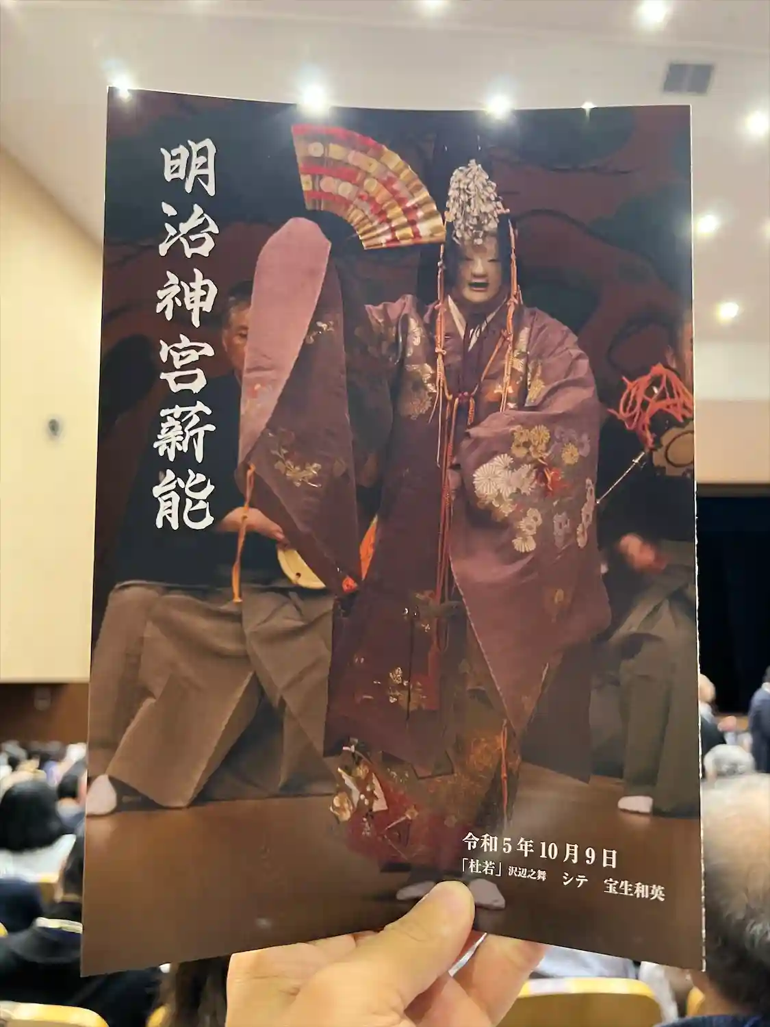 野外での能を薪能というのですが、生憎の雨で神宮会館内で行われました。