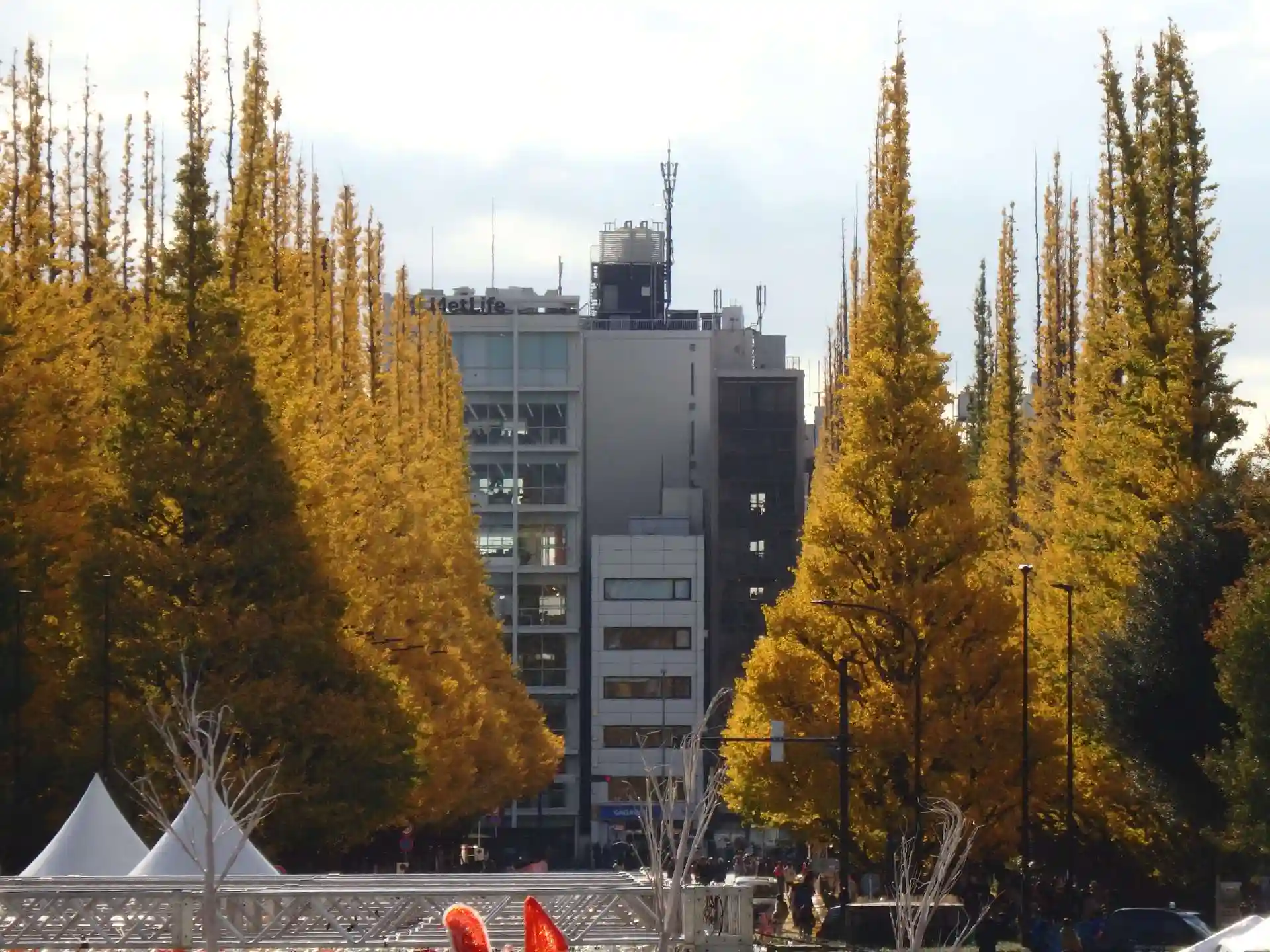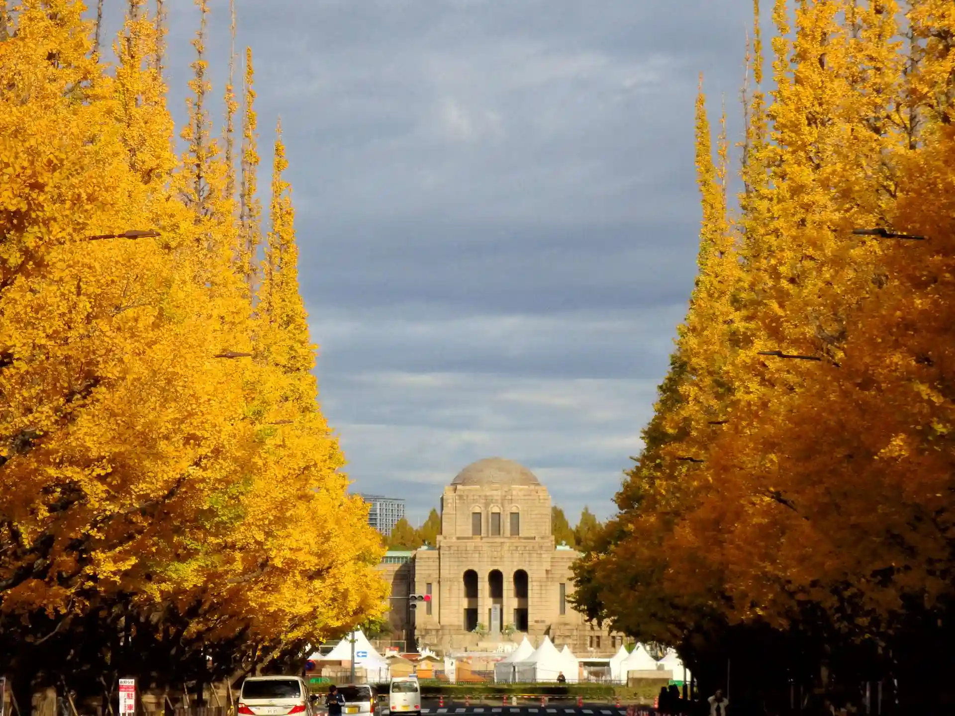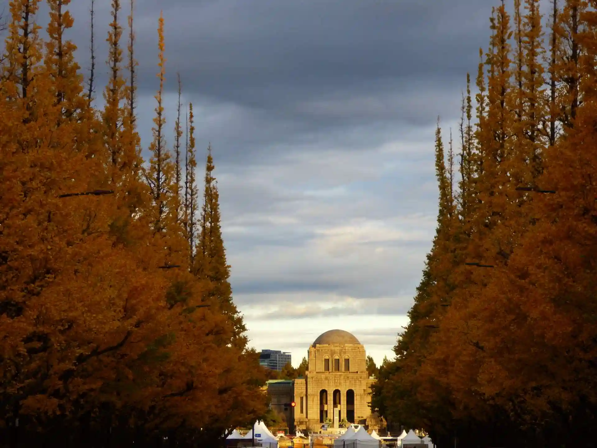 逆バージョンで絵画館から見るイチョウ並木。眼下では私には無縁のクリスマスマーケットが開催されてます。