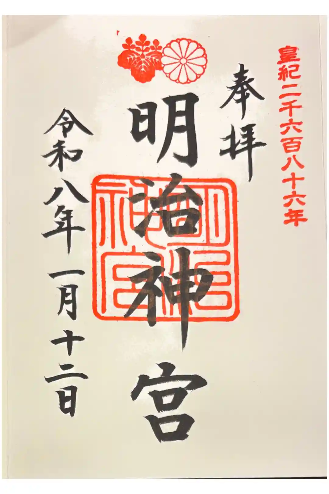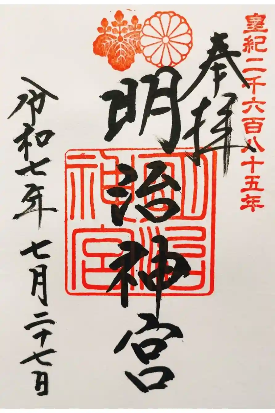 中央上には明治神宮のご神紋である桐と菊の印が押される。明治天皇と昭憲皇太后をおまつりすることから、皇室の紋がご神紋となっています。