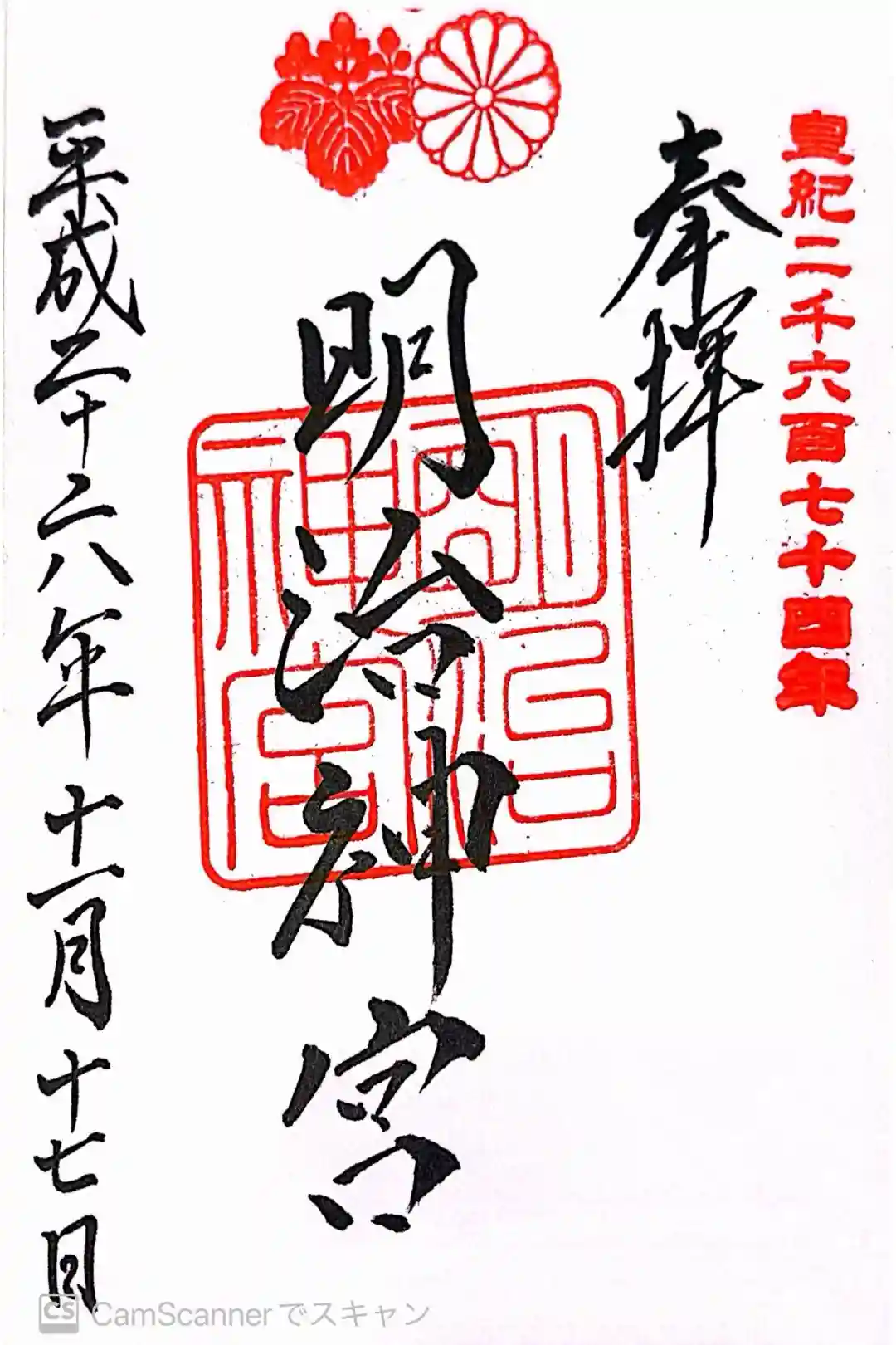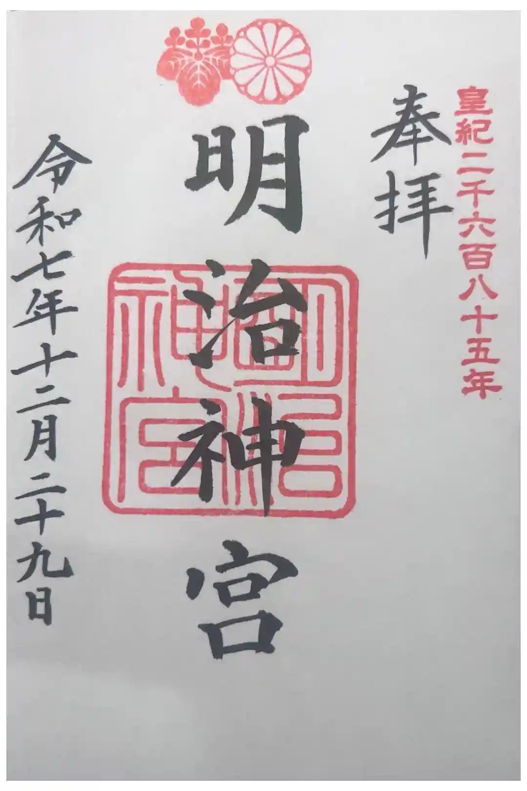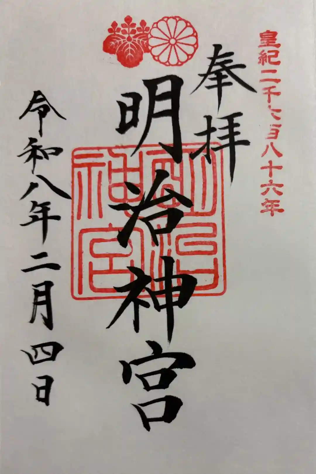 上部に菊と桐の印が入り、元号の他に皇紀の印が入った御朱印です。
