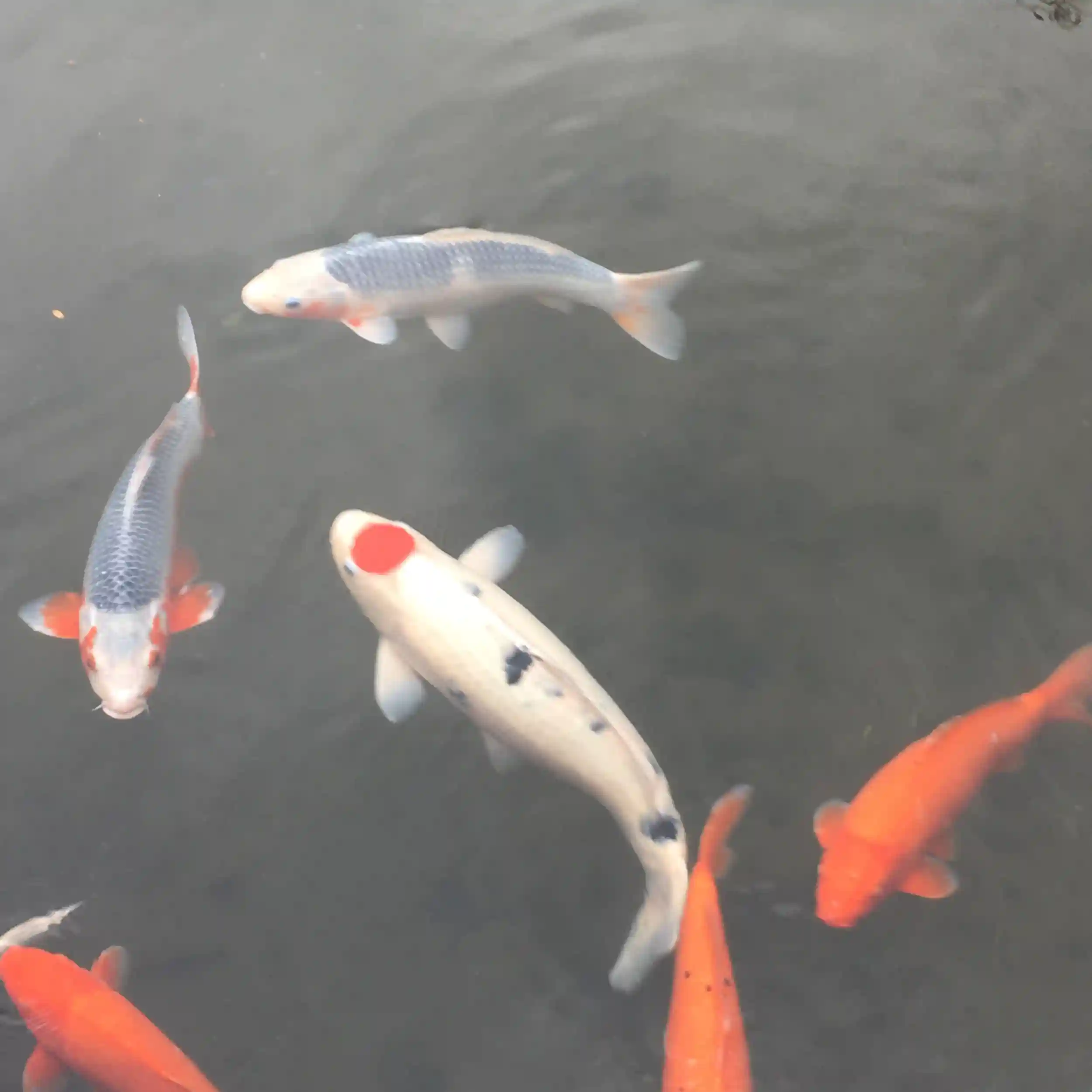 池では、頭に丸い日の丸の鯉が泳いでますね、