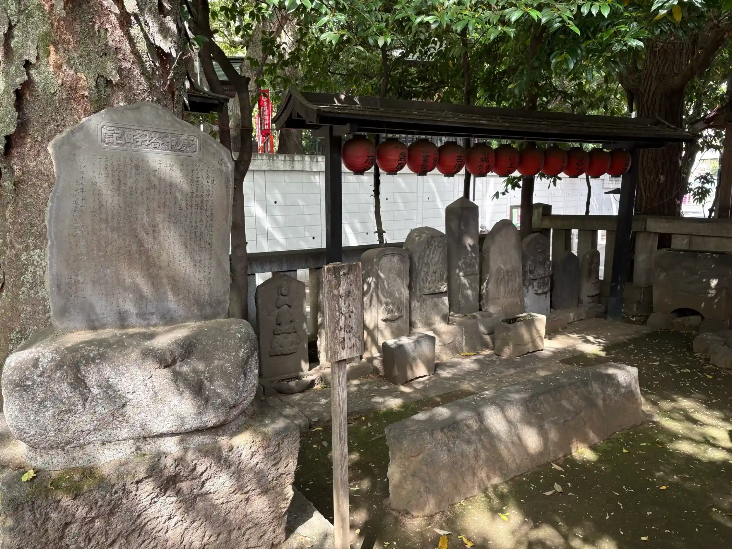 お目当ては同境内の庚申塔群。説明書きには13基とありますが、11基しか見当たりません。さまざまなタイプの庚申塔が一直線に横に並んでいます。