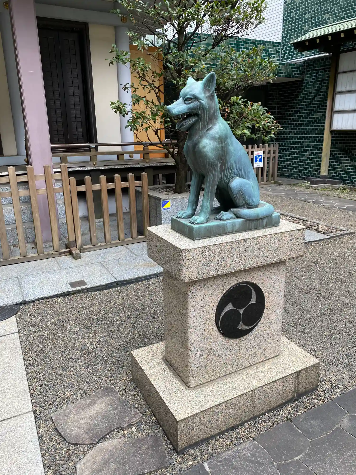 ニホンオオカミの狛犬さん。尻尾が巻いていて柴犬のようです。