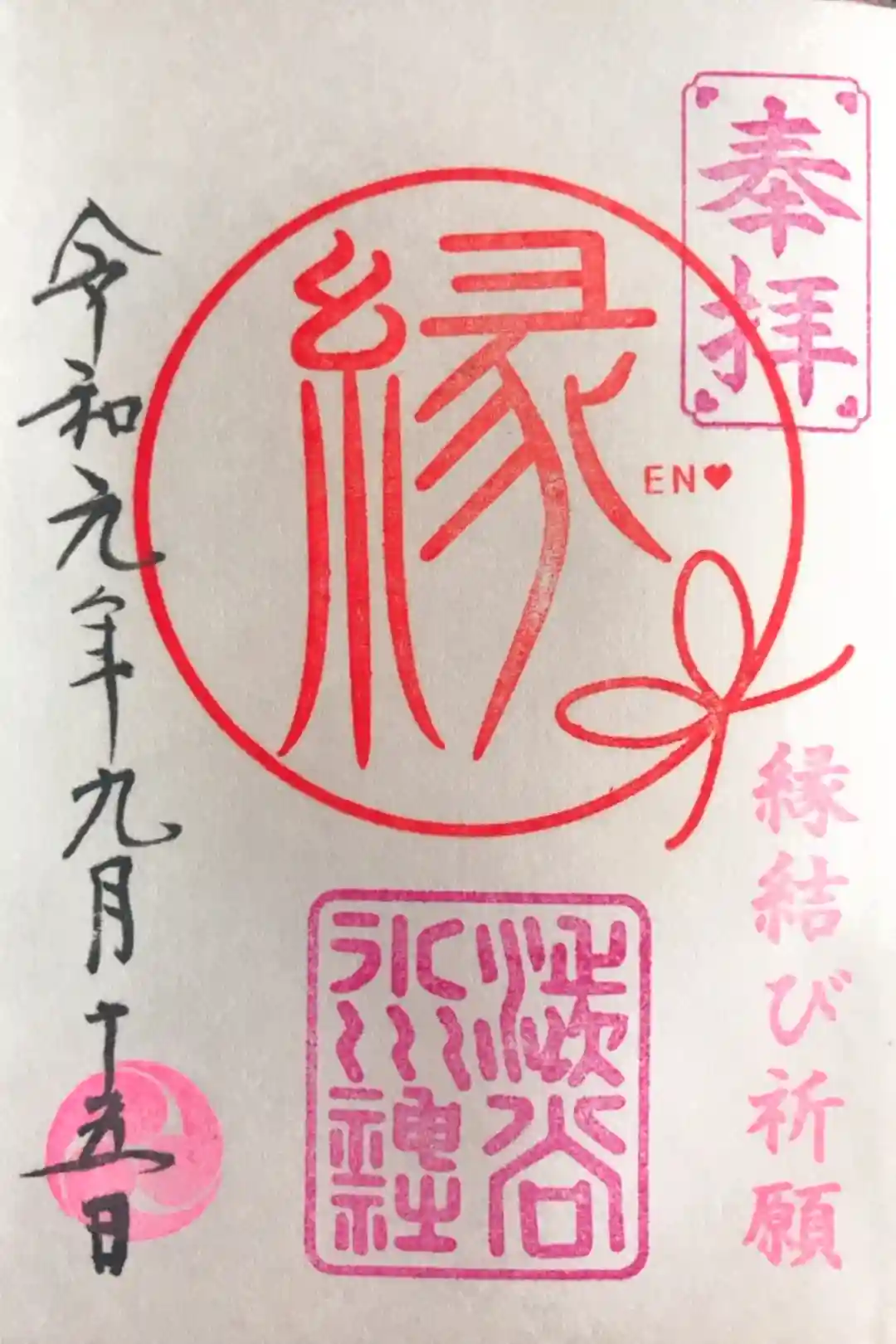 印は大きく「縁」と書かれ、社紋はピンクです