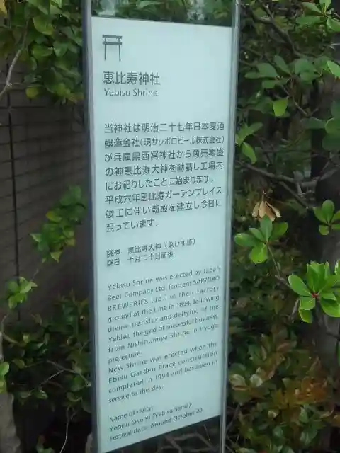 | ご由緒 | 明治27年に現サッポロビール株式会社が、兵庫県の西宮神社から商売繁盛のゑびす様を勧進し、工場内におまつりしたことに始まります。 平成6年に恵比寿ガーデンプレイスが建てられたことに伴い、新しく社殿が建てられました。 |