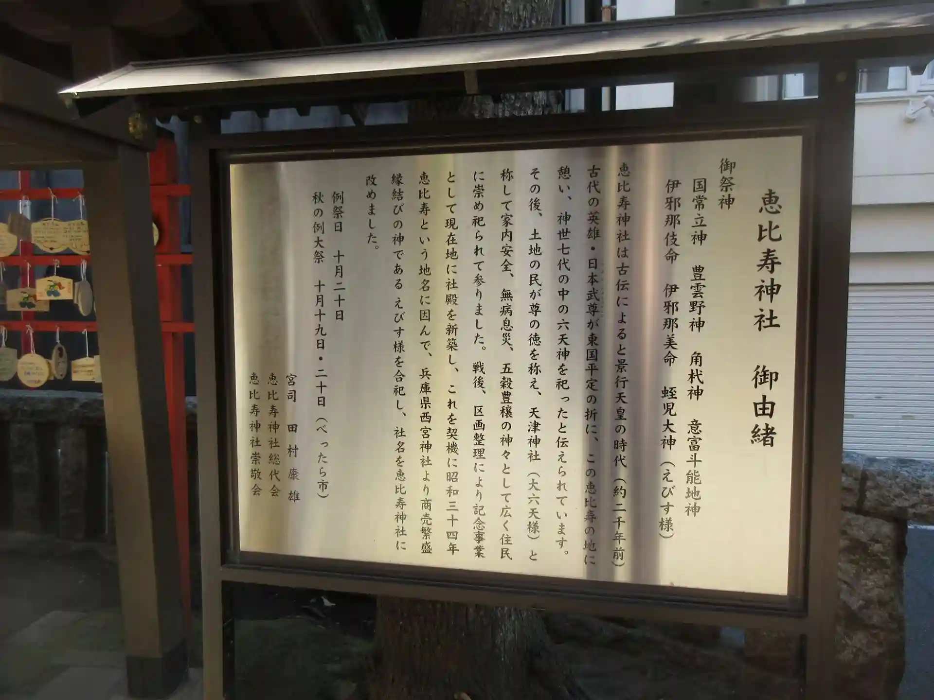 地名の元になった由緒正しい神社のはずだけれど、実はもともとここで祀られていたのは恵比寿様ではなかったというところが面白い。